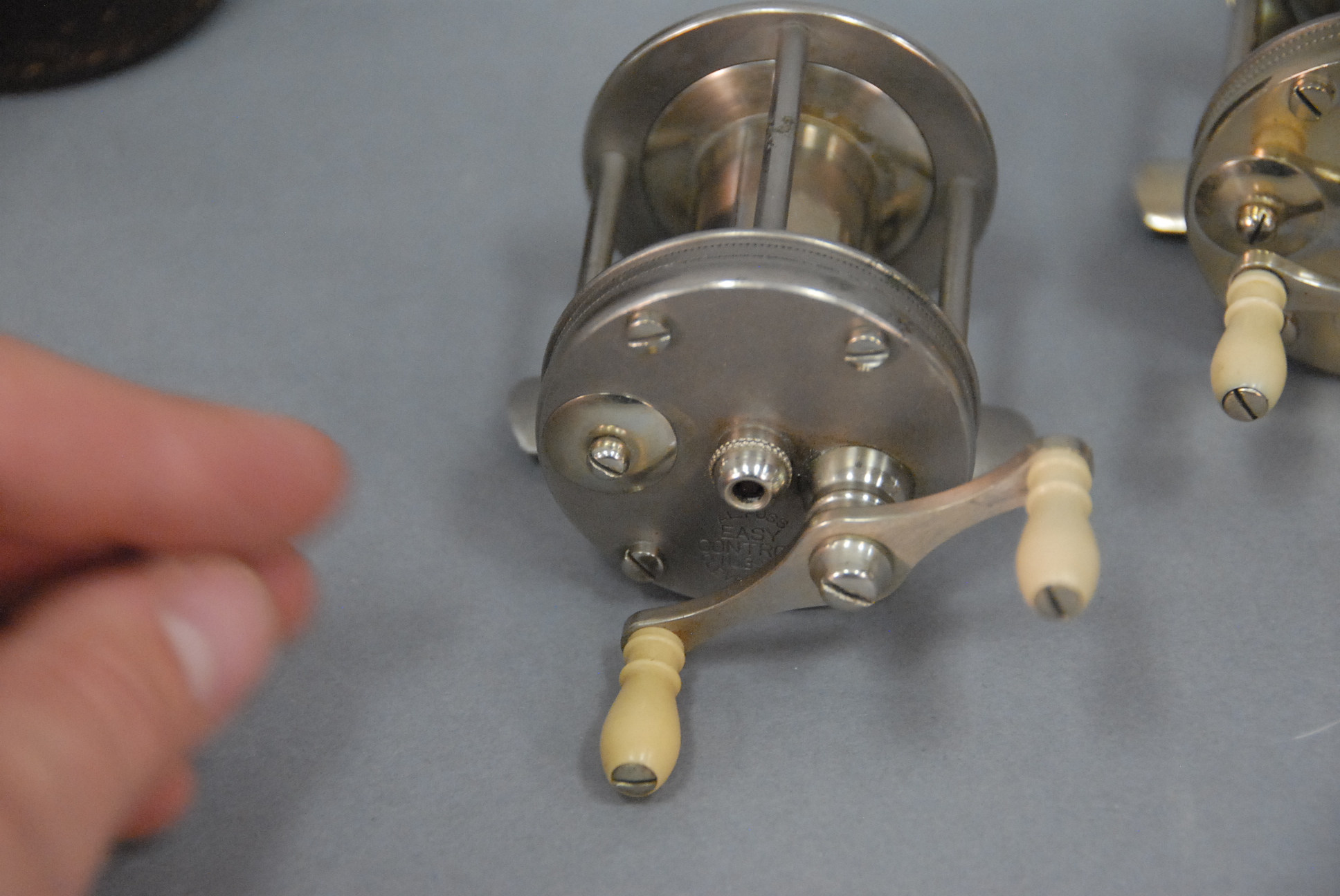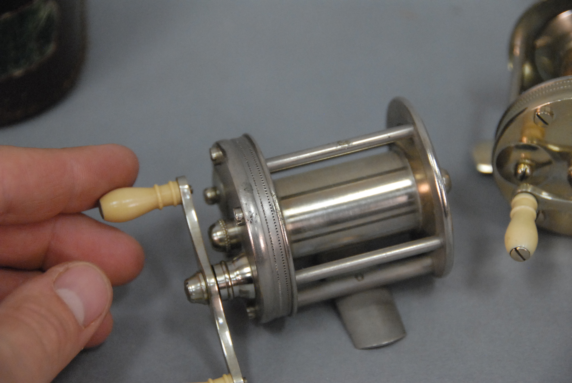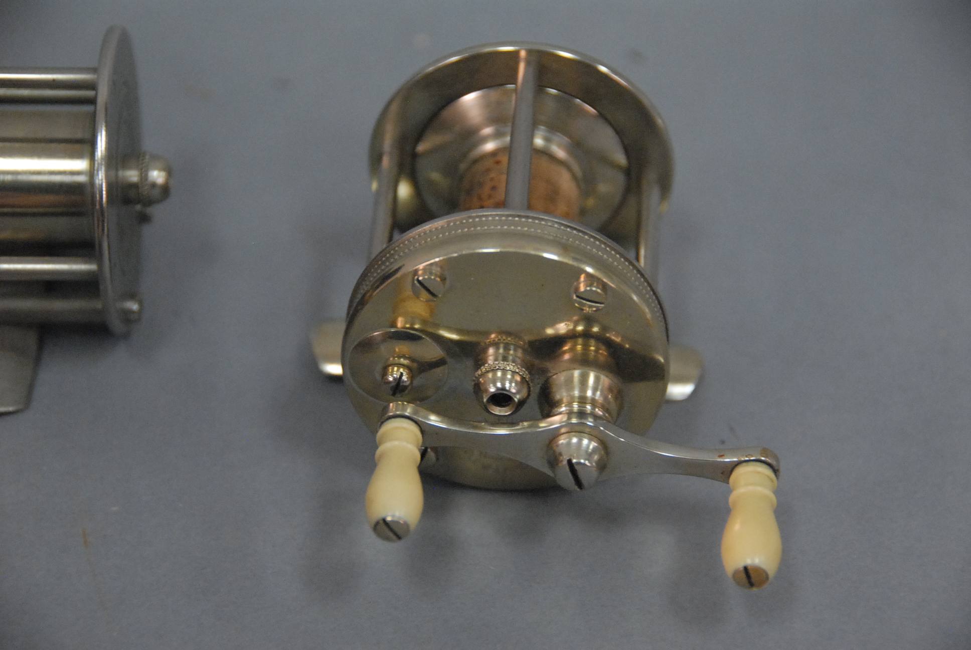 Lot 208: Four Al Foss German silver Easy Control tournament casting reels including one with cork spool, one with original paper label, and…