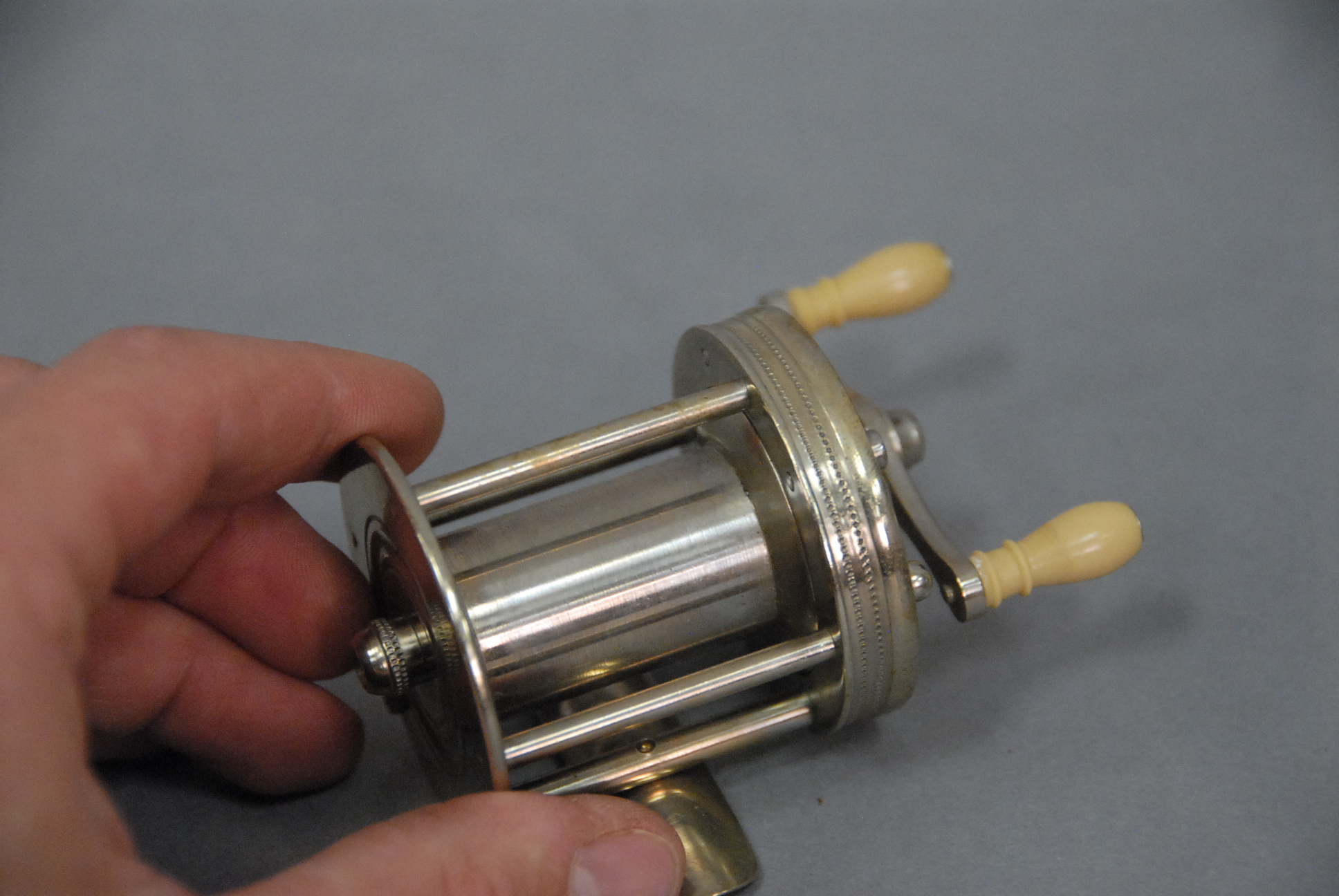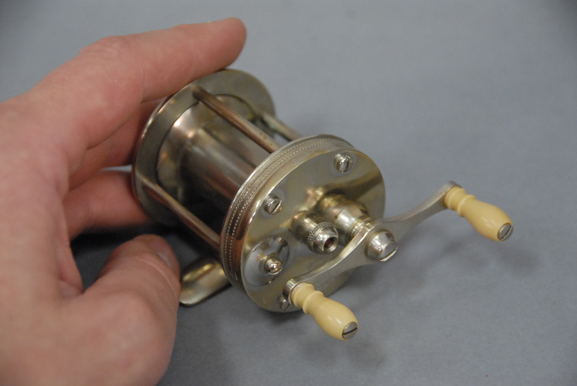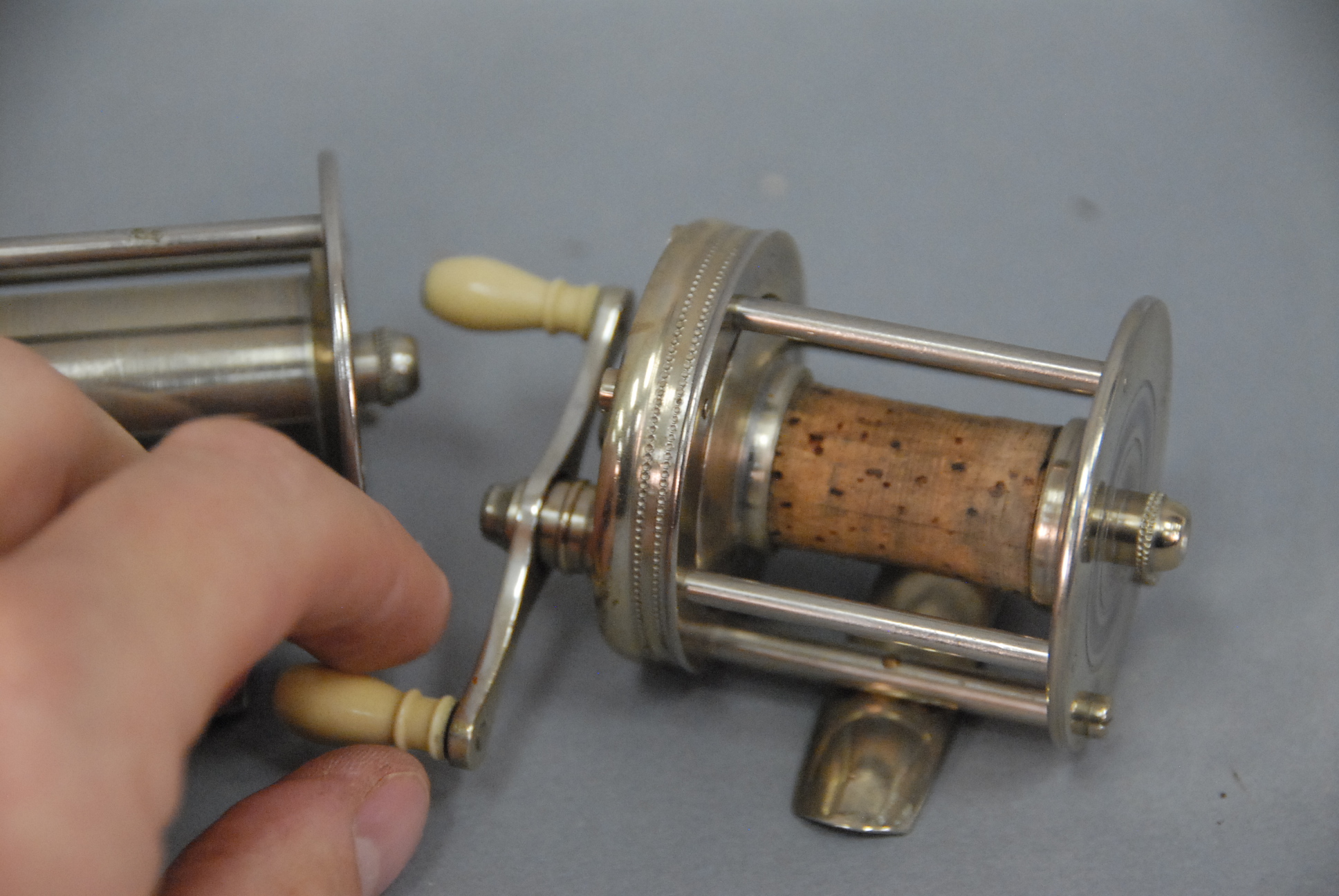 Lot 208: Four Al Foss German silver Easy Control tournament casting reels including one with cork spool, one with original paper label, and…