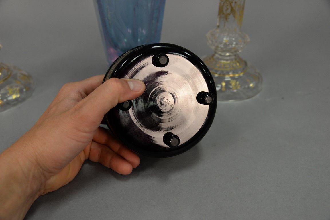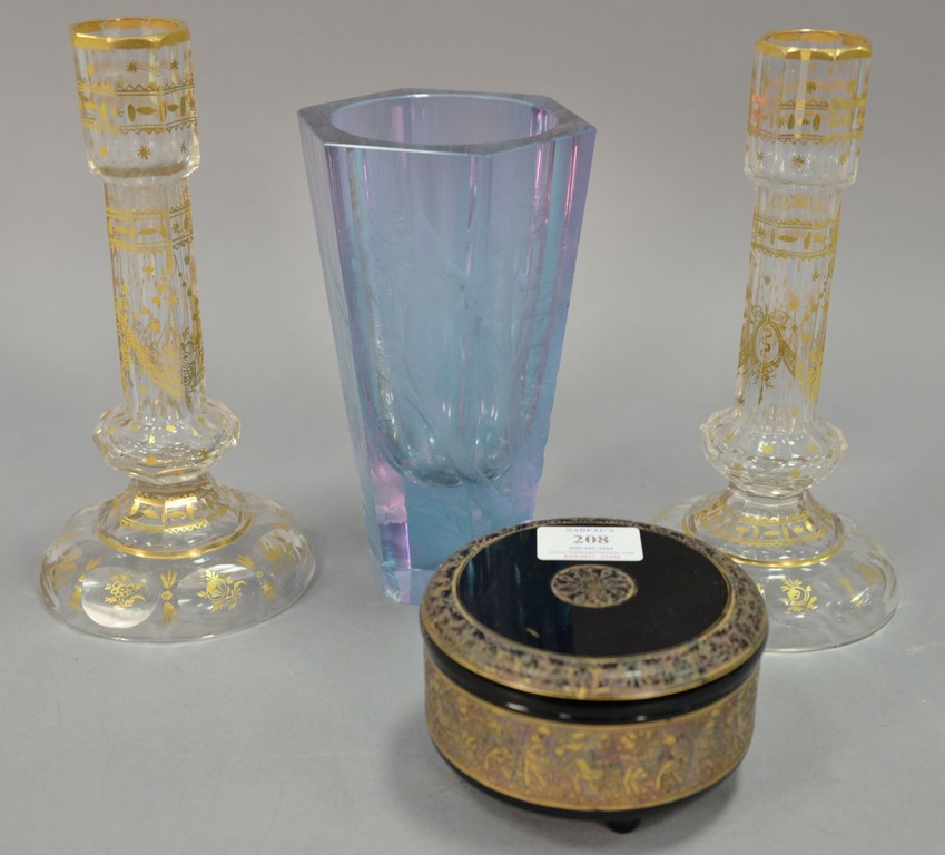 Four crystal pieces to include Moser etched glass vase light blue with etched wooded landscape chips on base, Moser Karlsbad amethyst covered box signed Moser Karlsbad made in Czechoslovakia, and a pair of crystal candlesticks with gilt decoration ht. 9 1/2in..