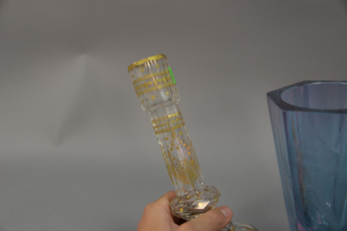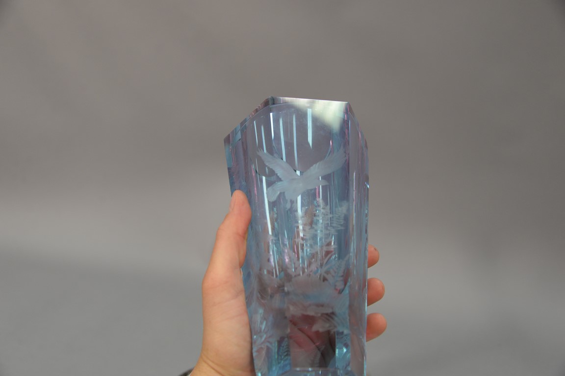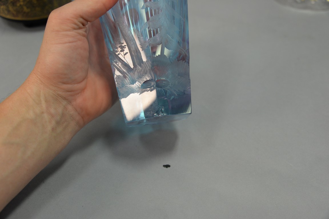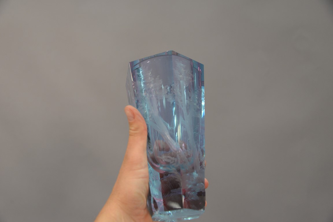 Lot 208: Four crystal pieces to include Moser etched glass vase light blue with etched wooded landscape chips on base, Moser Karlsbad ameth…