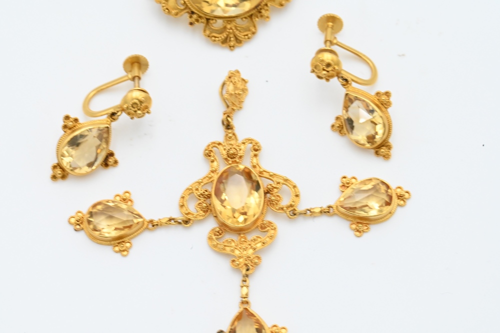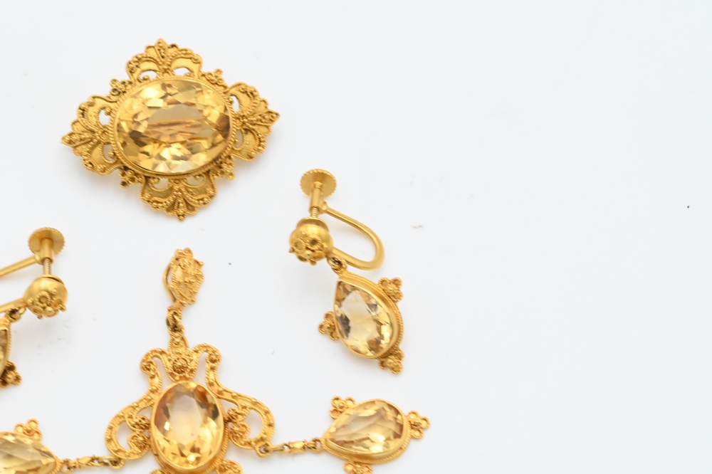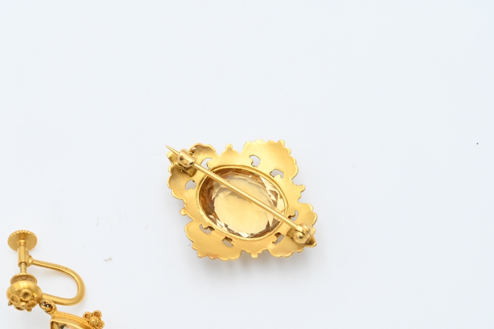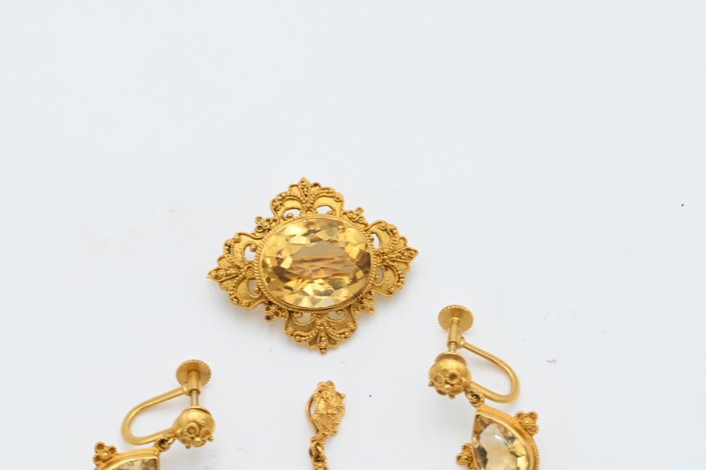 Lot 208: Four Piece 14 Karat Gold Edwardian Set, to include a pair of screw back earrings, brooch, and pendant, all set with yellow stones. P…