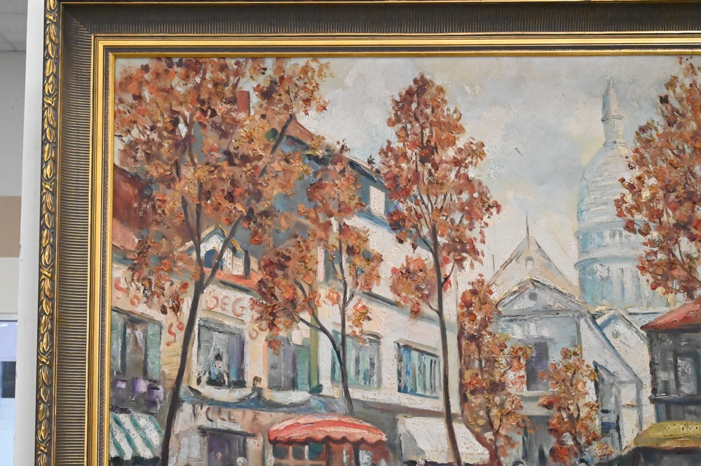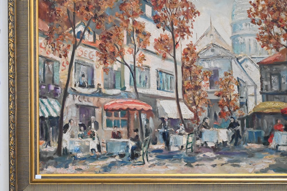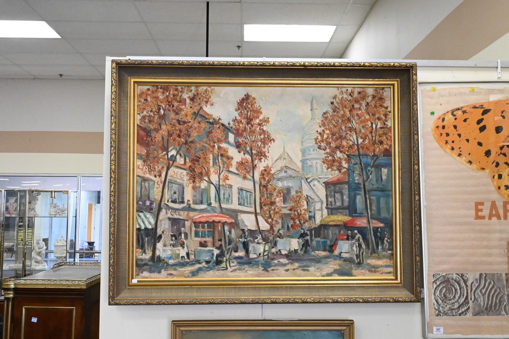 Lot 208: French School (20th century), courtyard scene, oil on canvas, signed lower right, height 30 inches, width 40 1/4 inches.