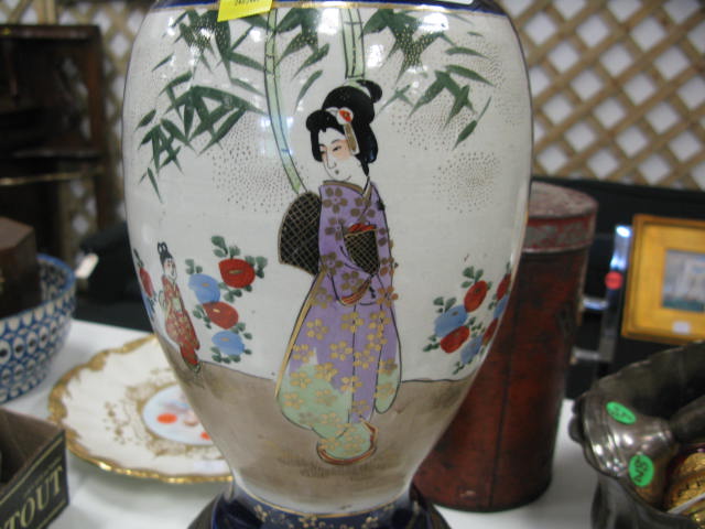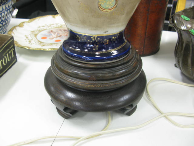 Group of misc items to include lamp, partial china set, brass item, doll, half moon, etc