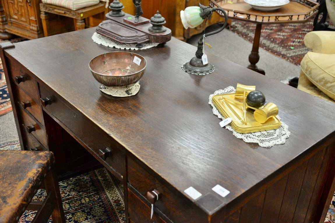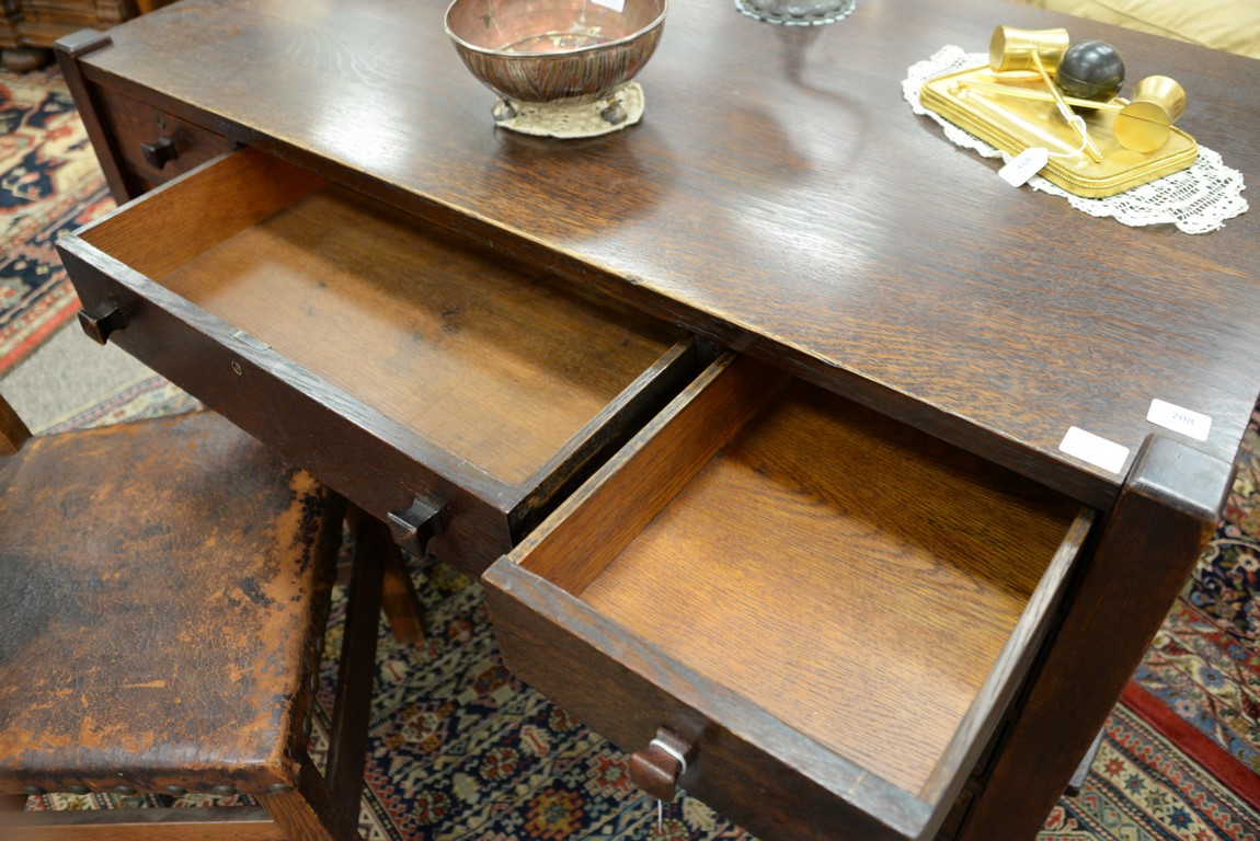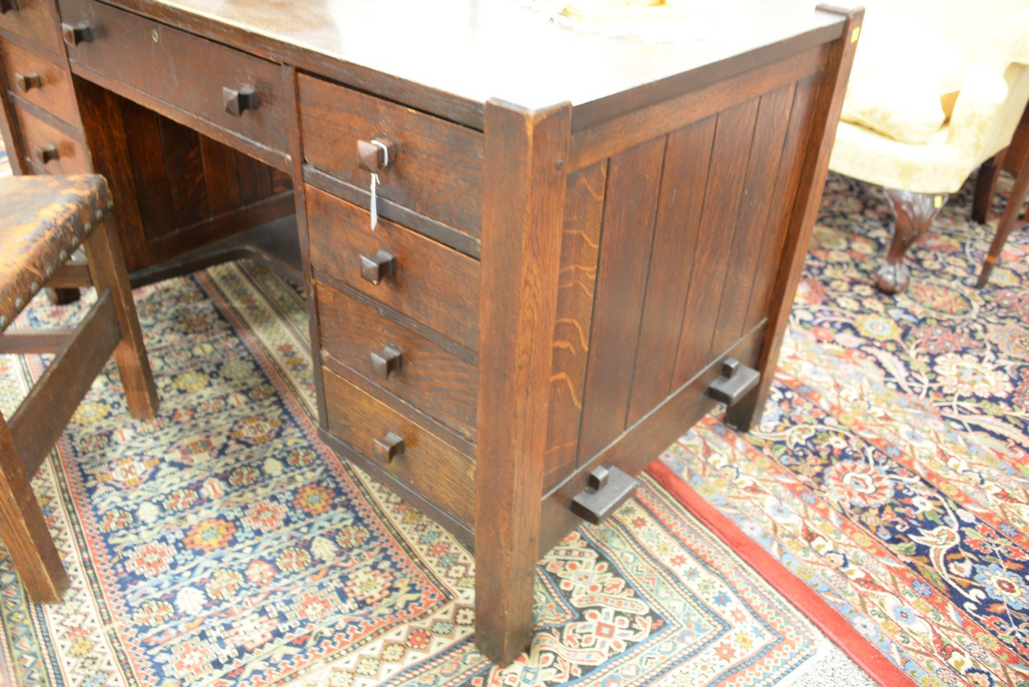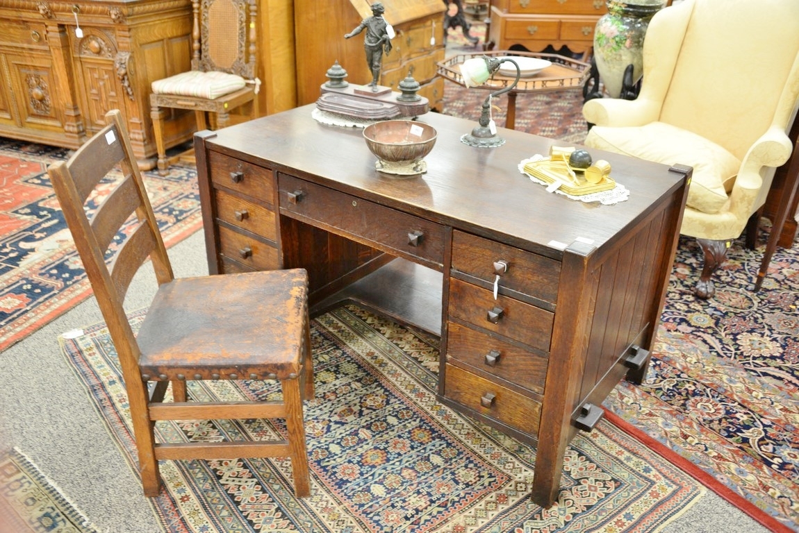 Lot 208: Gustav Stickley Mission oak two piece lot including desk and chair, desk with original pulls and original finish and a side chair wi…