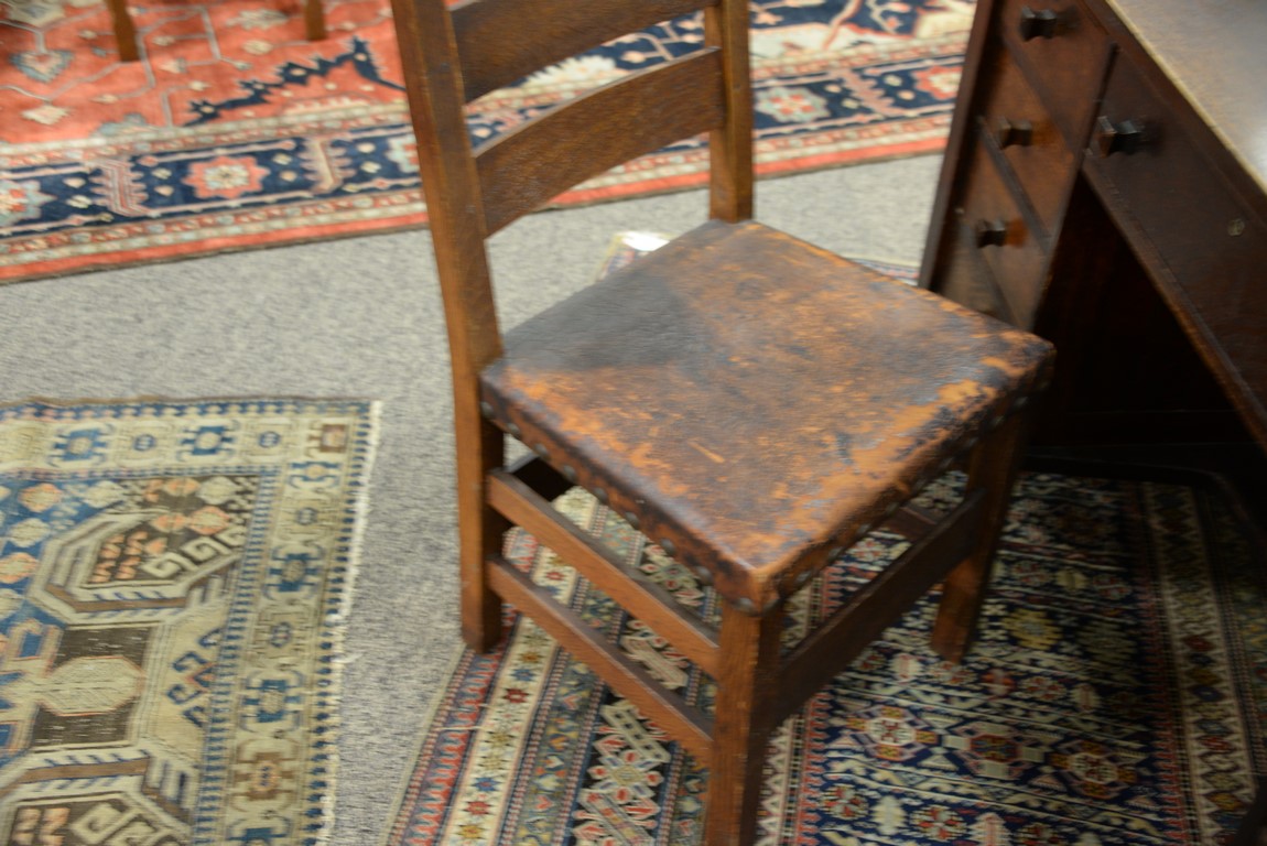 Gustav Stickley Mission oak two piece lot including desk and chair, desk with original pulls and original finish and a side chair with three slat back and original leather seat marked with impressed tool mark, original finish.