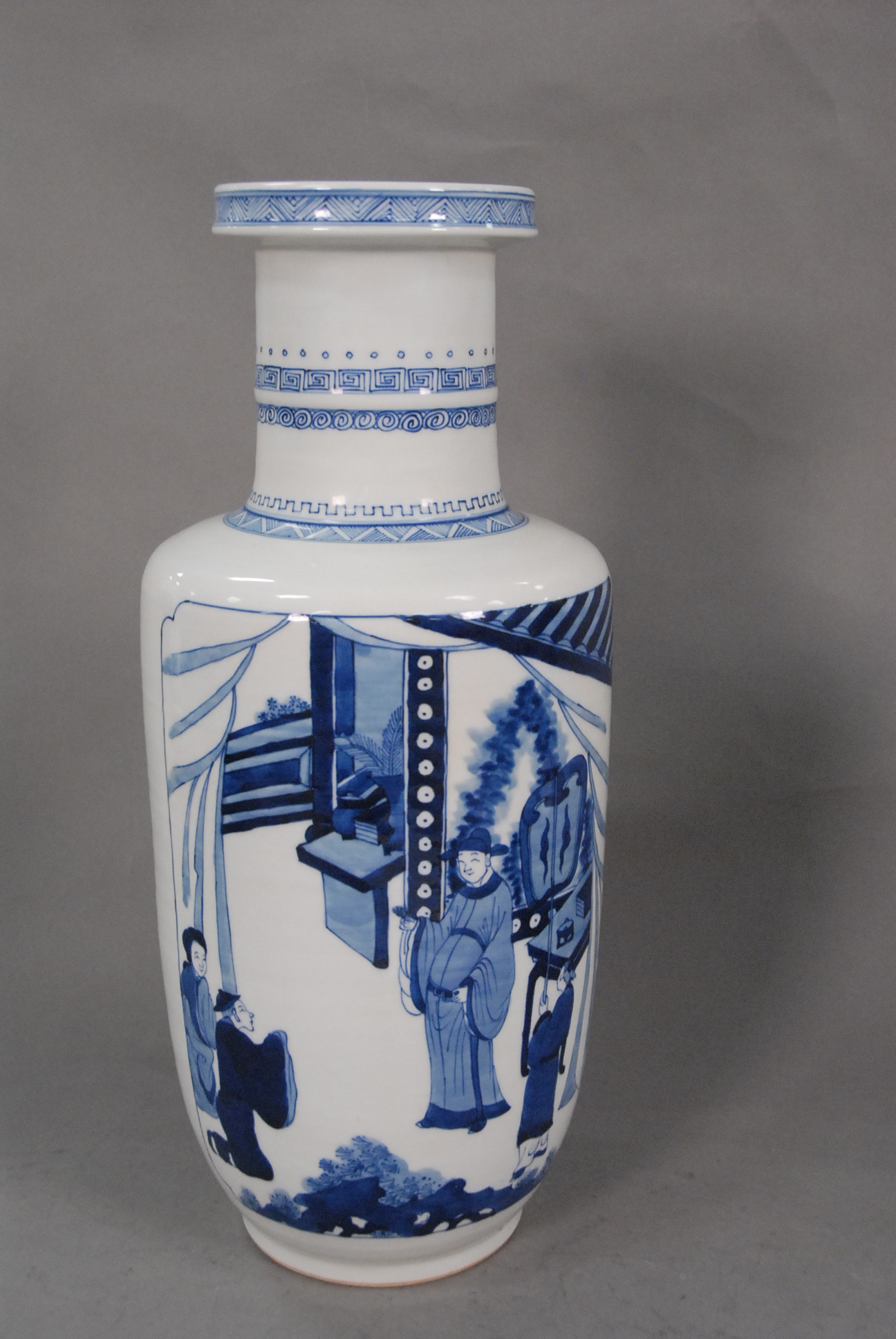 Large blue and white rouleav vase painted with interior scene.