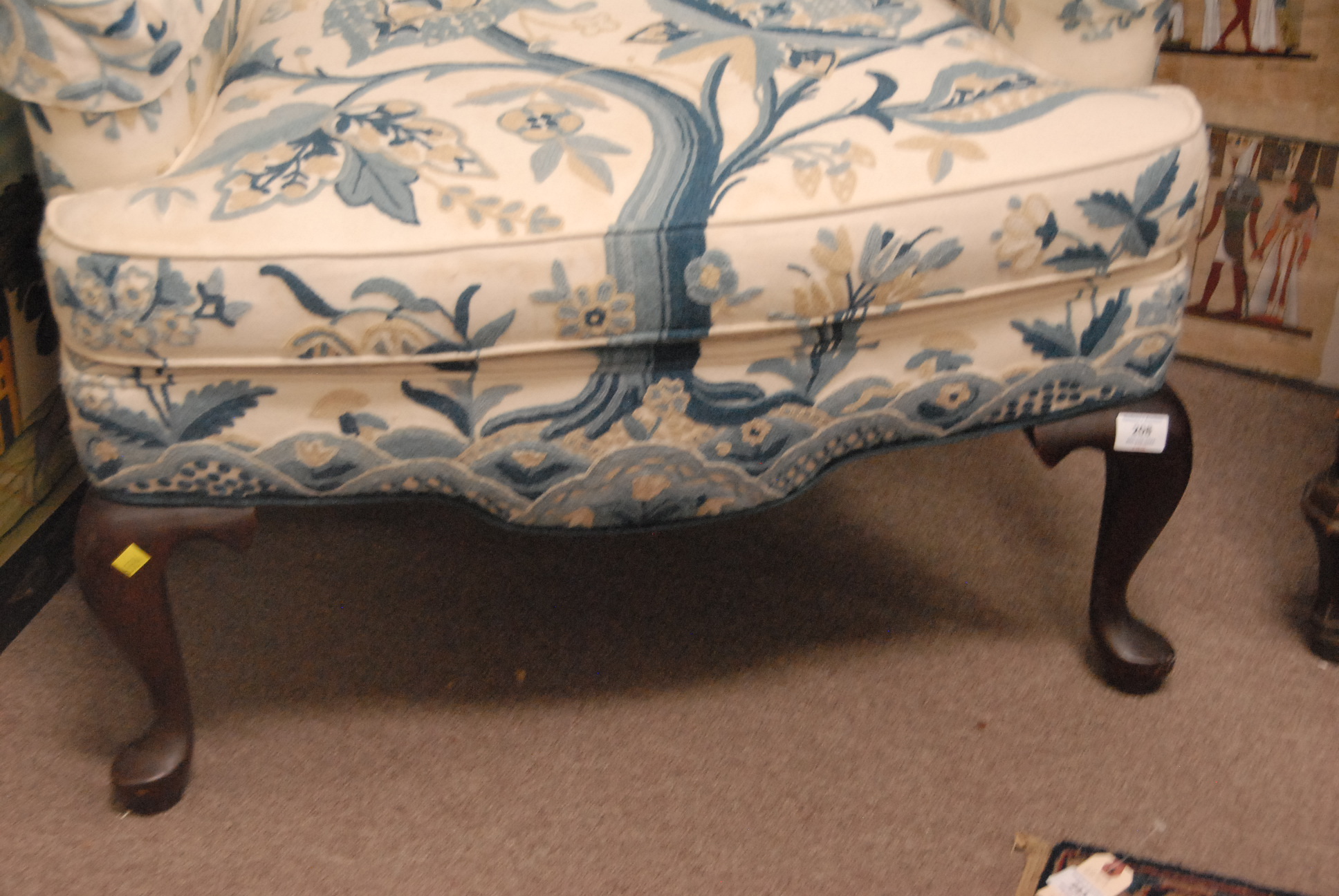 Queen Anne style upholstered wing chair with crewel work upholstery.