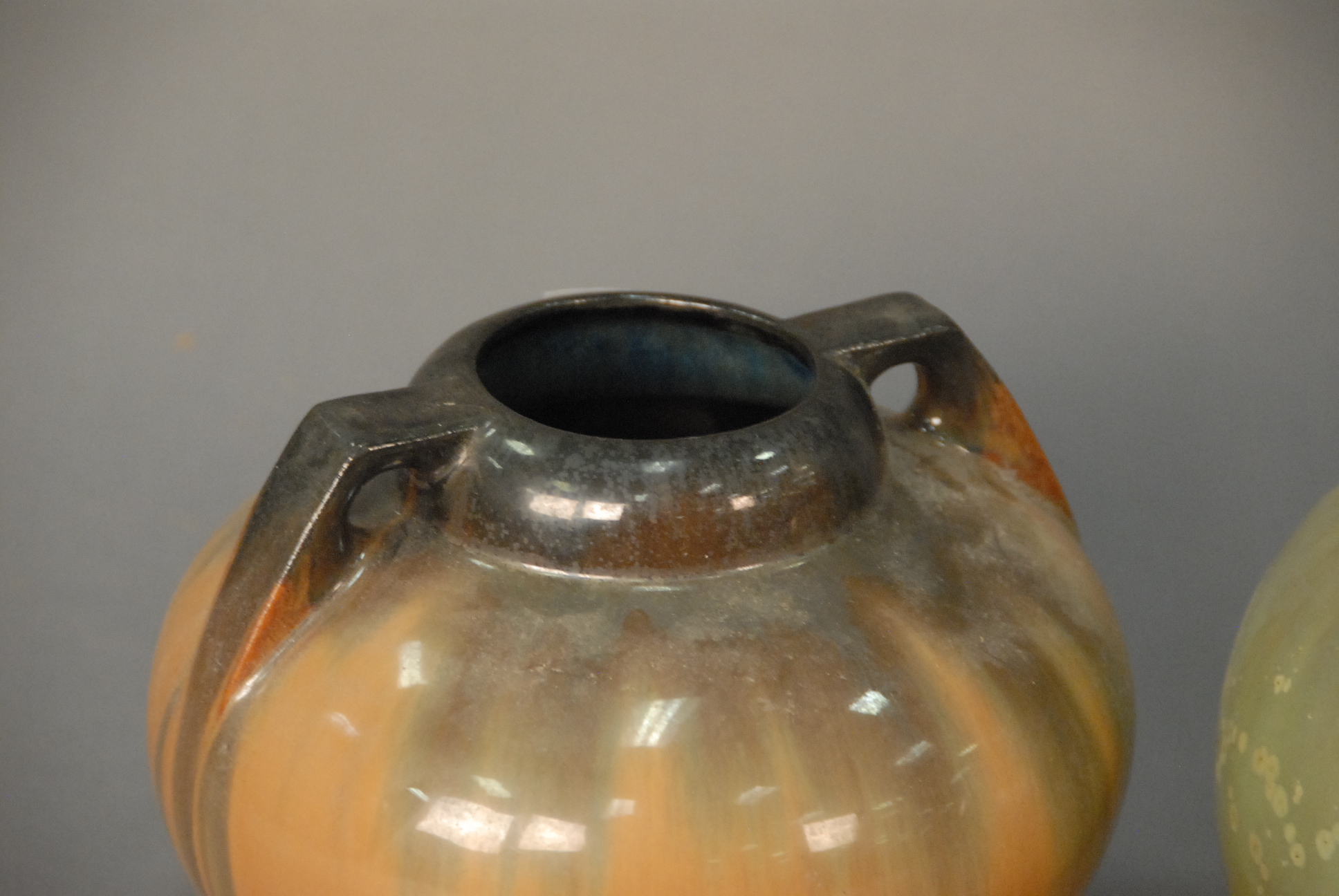 Three piece lot to include candlestick holder and two Fulper pottery vases one with handle.