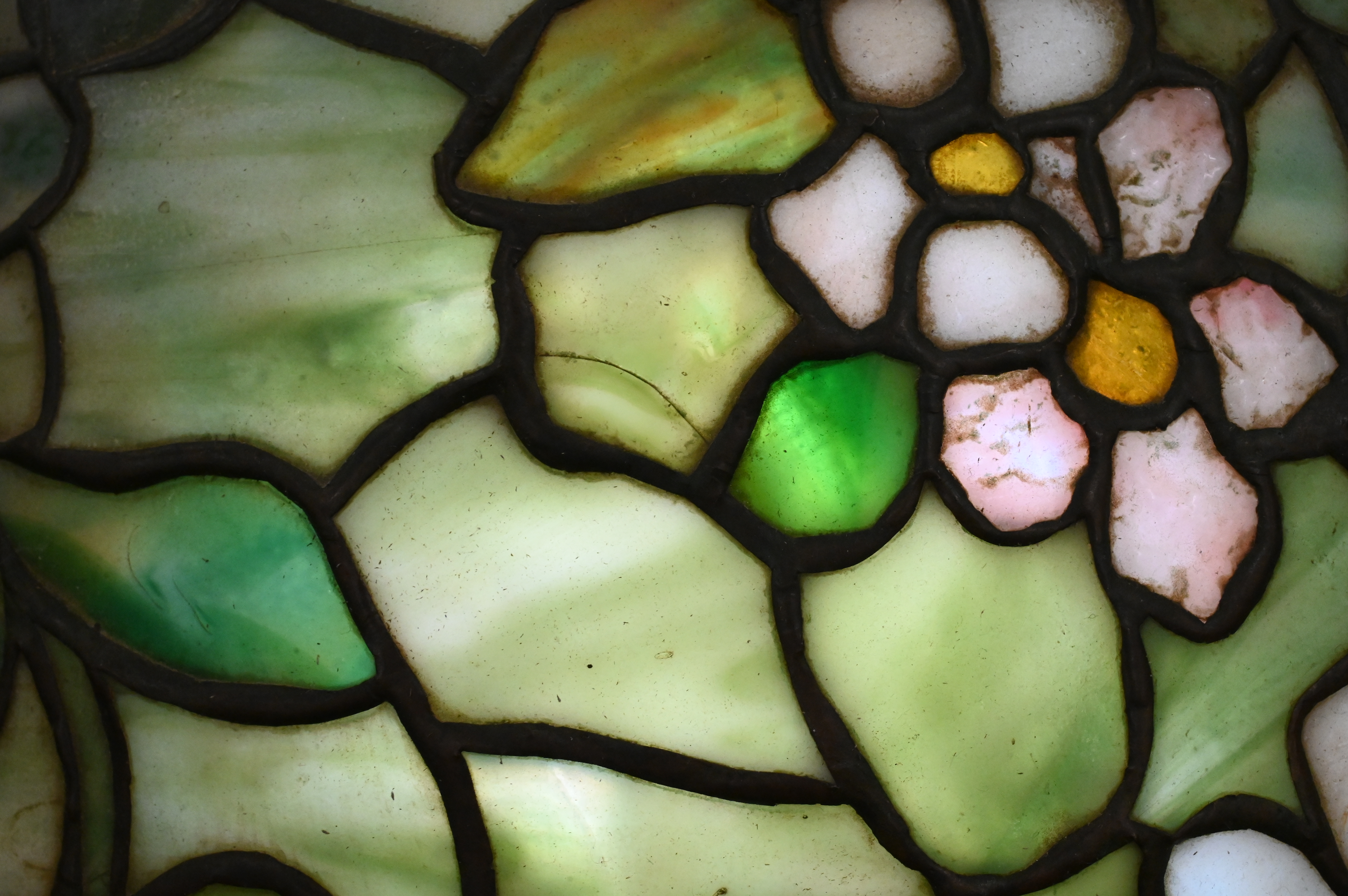 domed leaded-glass shade composed of delicately mottled favrile glass in a pastoral palette of whites, pale pinks, celadon, and soft leaf greens, depicting clusters of early spring apple blossoms interwoven with slender branches and new foliage, the blossoms are articulated with subtle striations and milky opalescence, producing a gentle, atmospheric glow when lit, mounted on an original patinated bronze, chased pod base, its organic contours and flaring foot enriched with a deep brown patina showing desirable untouched surface, shade signed “tiffany Studios New York, base signed :Tiffany Studios New York 533”