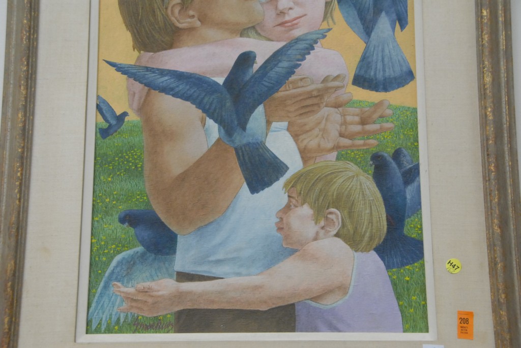 Vincent T. Smarkusz 1919-1974 oil on masonite painting of a family with pigeons signed lower left Smarkusz.