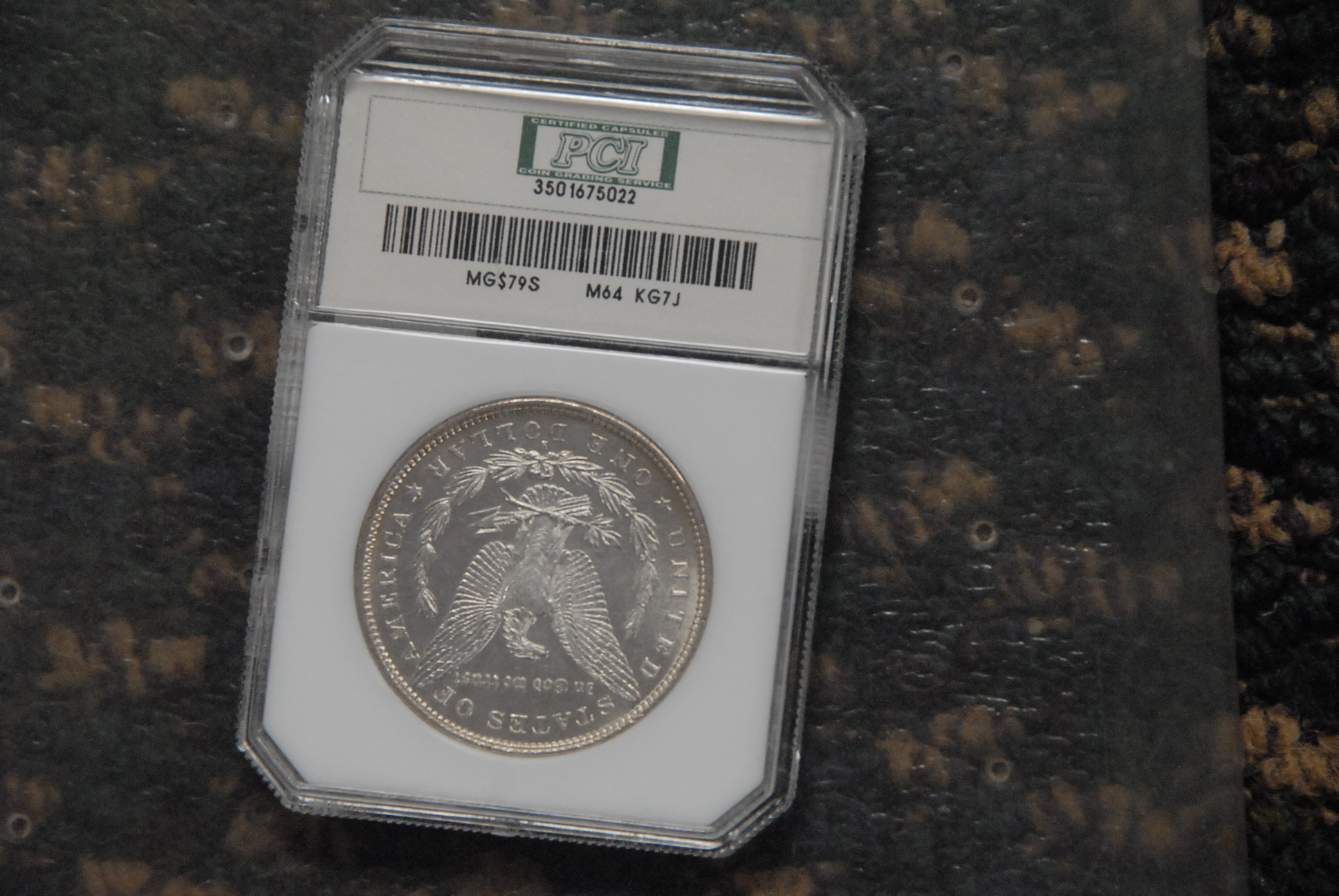 1879S Morgan silver dollar, slabbed.
