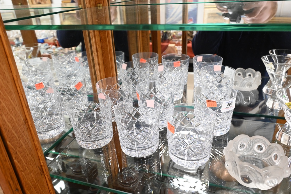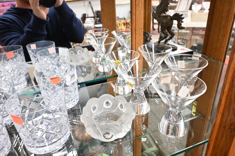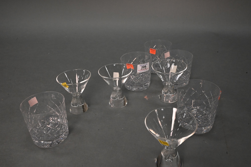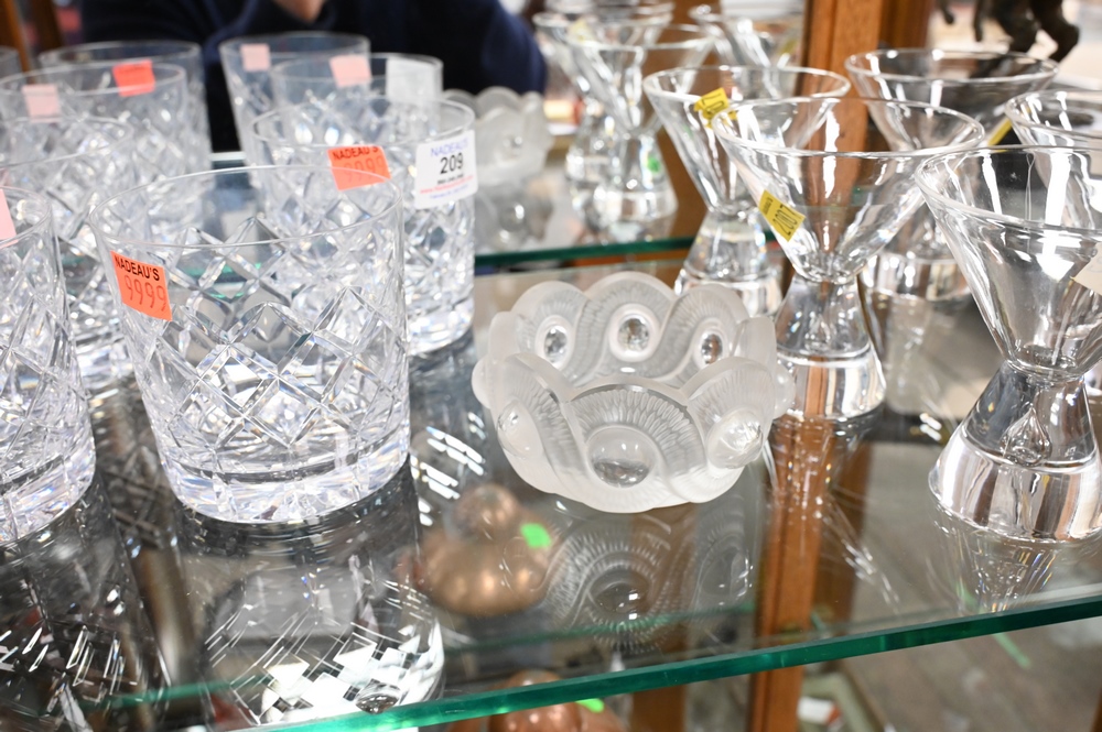 Lot 209: 12 Piece Glass Lot, to include set of six Cartier crystal rock glasses, set of five Steuben teardrop cocktail glass along with a lalique dish, rock glass height 3 5/8 inches, cocktail glass height 4 inches.