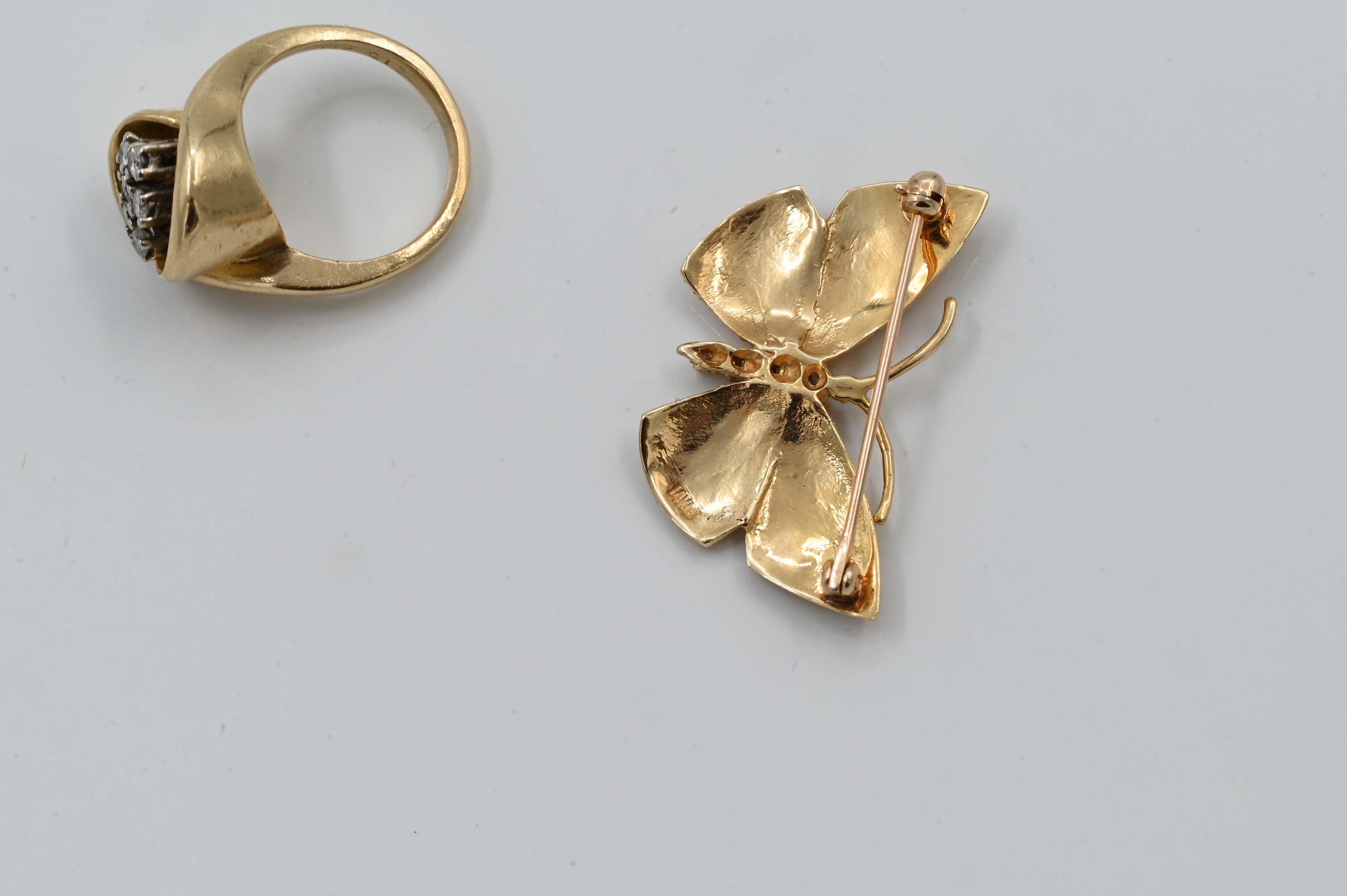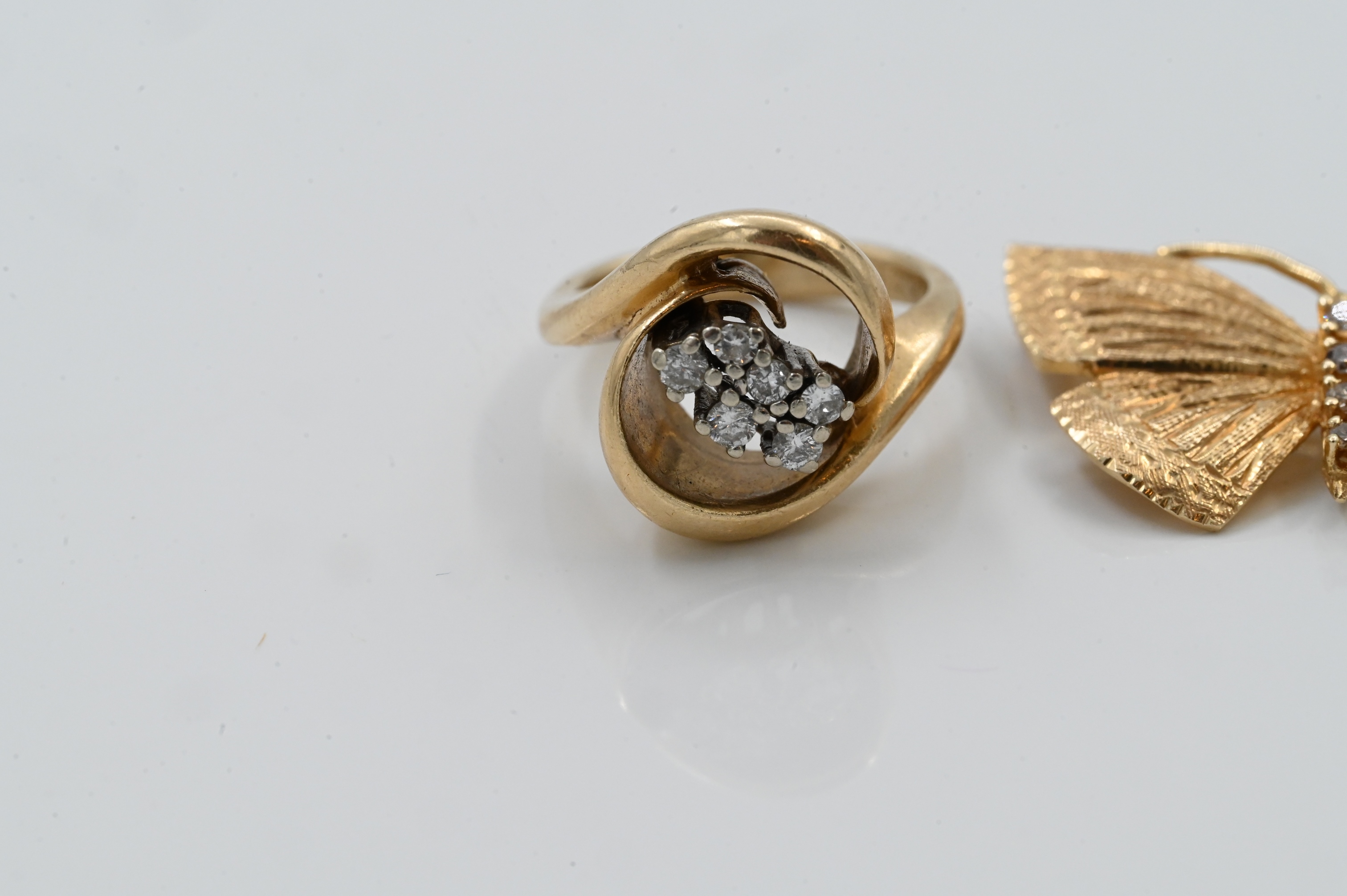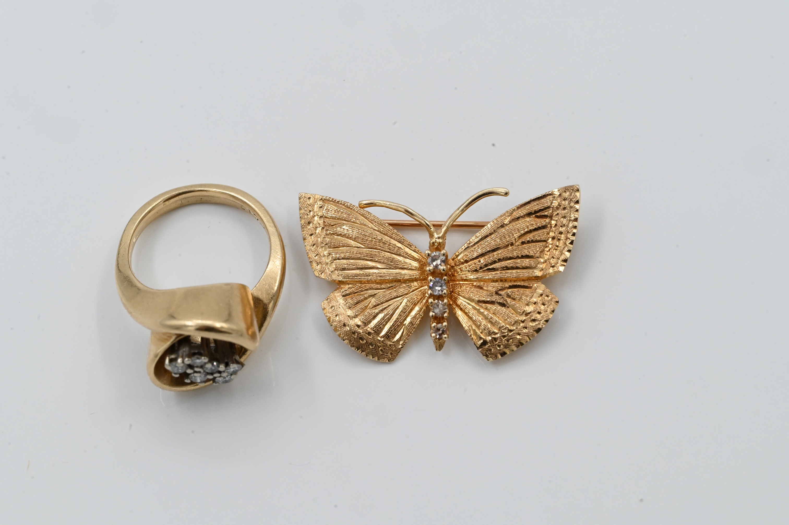 to include ring with 6 small diamonds size 4, and a butterfly pin with 4 small diamonds, width 1 1/4. Both marked 14K