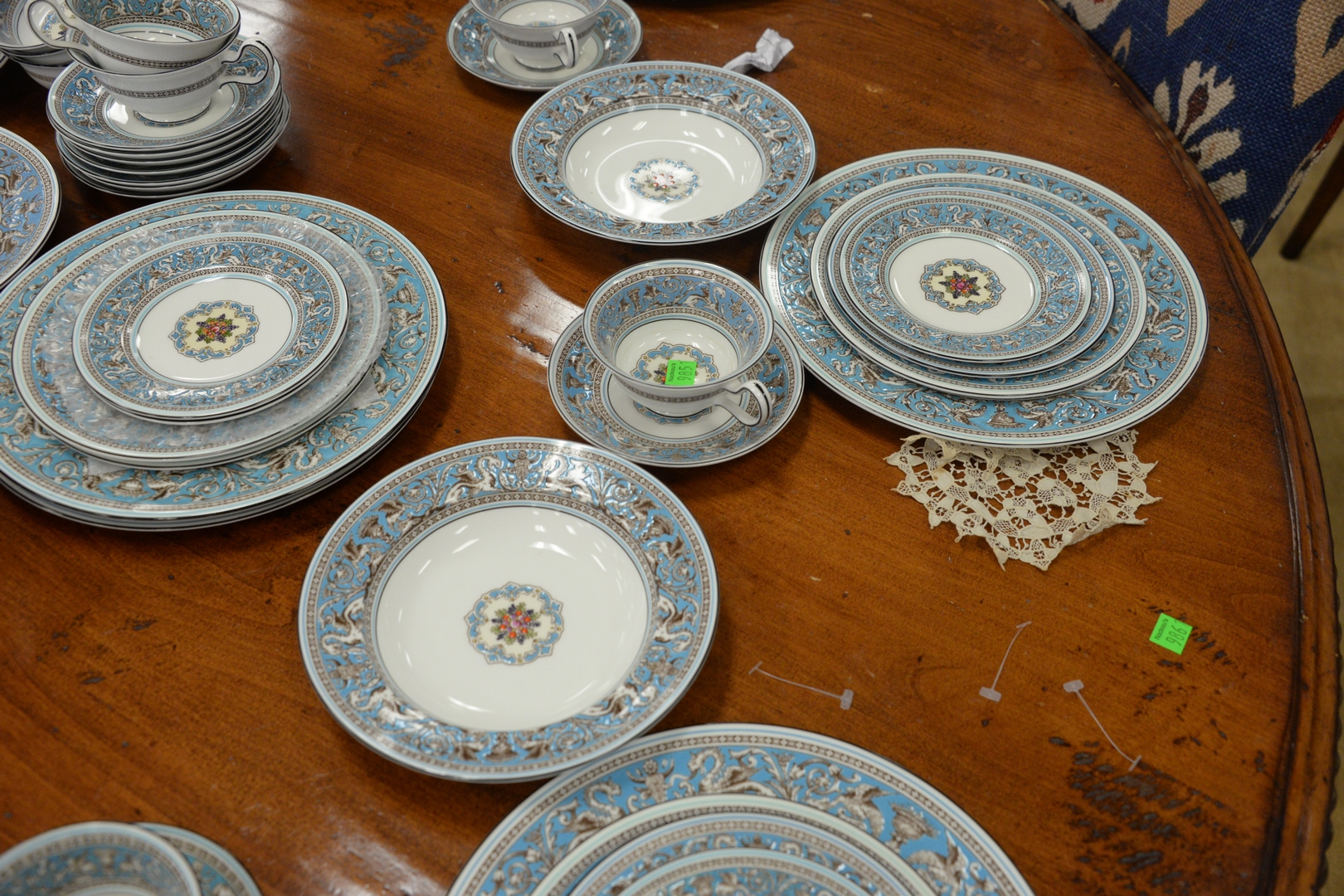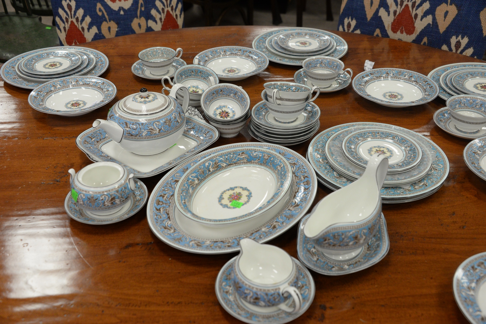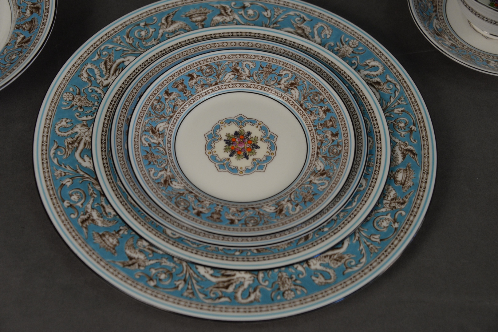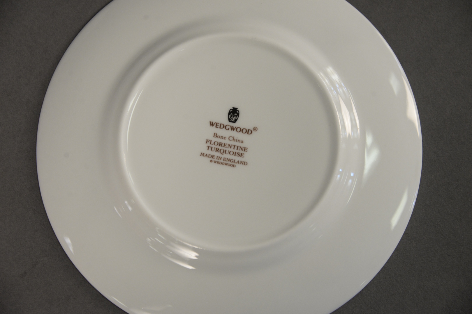 Lot 209: 81 Piece Lot of Wedgwood “Turquoise Florentine” Dinner Service, to include 10 dinner plates, 6 soup bowls, 10 luncheon plates, 6 dessert plates, 10 bread and butter plates, 16 teacups, 16 saucers, 1 gravy bowl and underdish, 1 vegetable bowl, 2 serving plates, 1 sugar, 1 cream, 1 teapot, each marked to the underside, dinner plate diameter 11 inches.