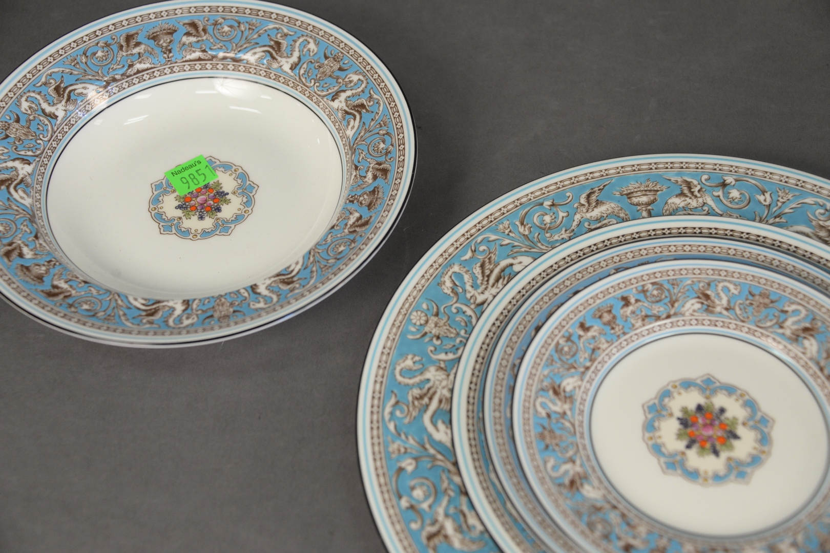 81 Piece Lot of Wedgwood “Turquoise Florentine” Dinner Service, to include 10 dinner plates, 6 soup bowls, 10 luncheon plates, 6 dessert plates, 10 bread and butter plates, 16 teacups, 16 saucers, 1 gravy bowl and underdish, 1 vegetable bowl, 2 serving plates, 1 sugar, 1 cream, 1 teapot, each marked to the underside, dinner plate diameter 11 inches.