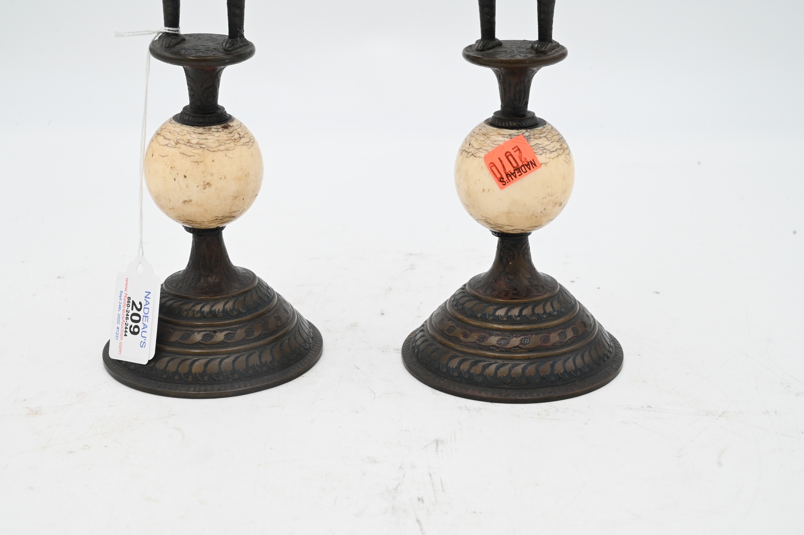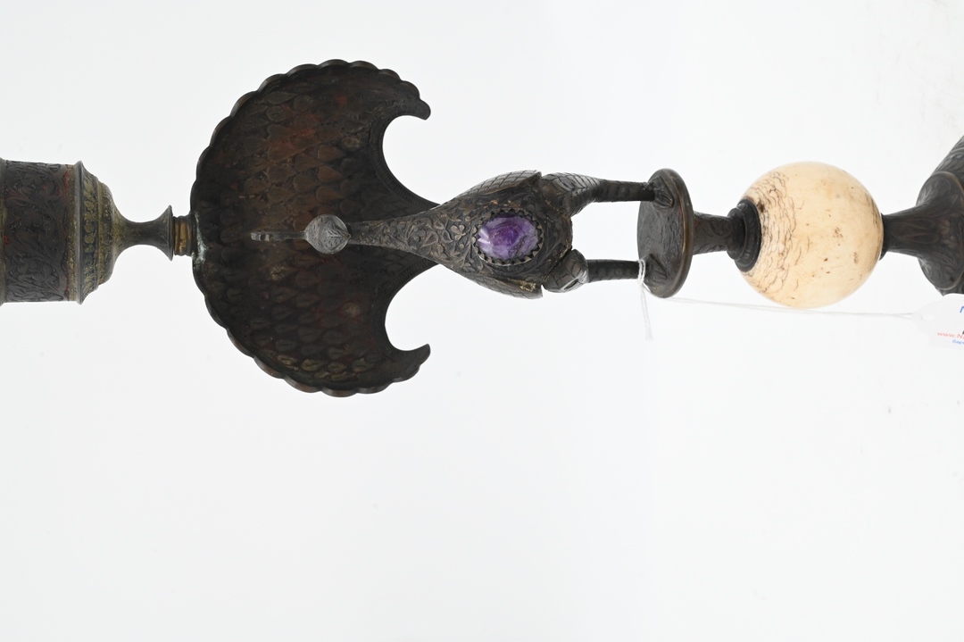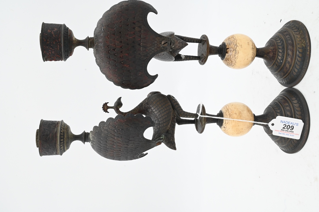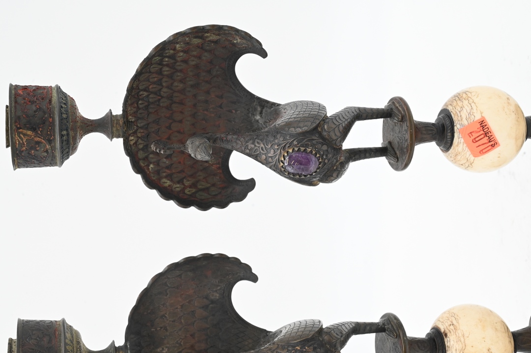 A Pair of Brass Peacock Bird Form Candleholders, mounted with oval amethyst, height 14 inches.
