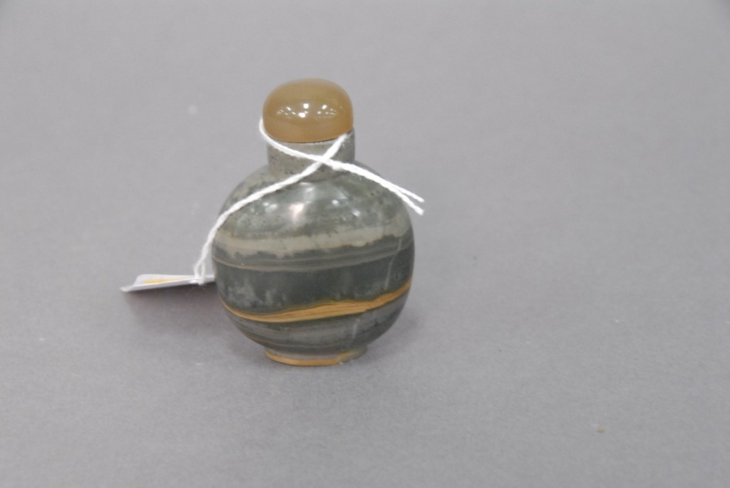 Banded agate snuff bottle having an overall green/grey color with bands of tan, with agate top, ht 2 1/2.