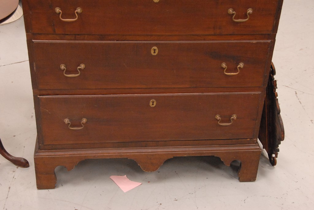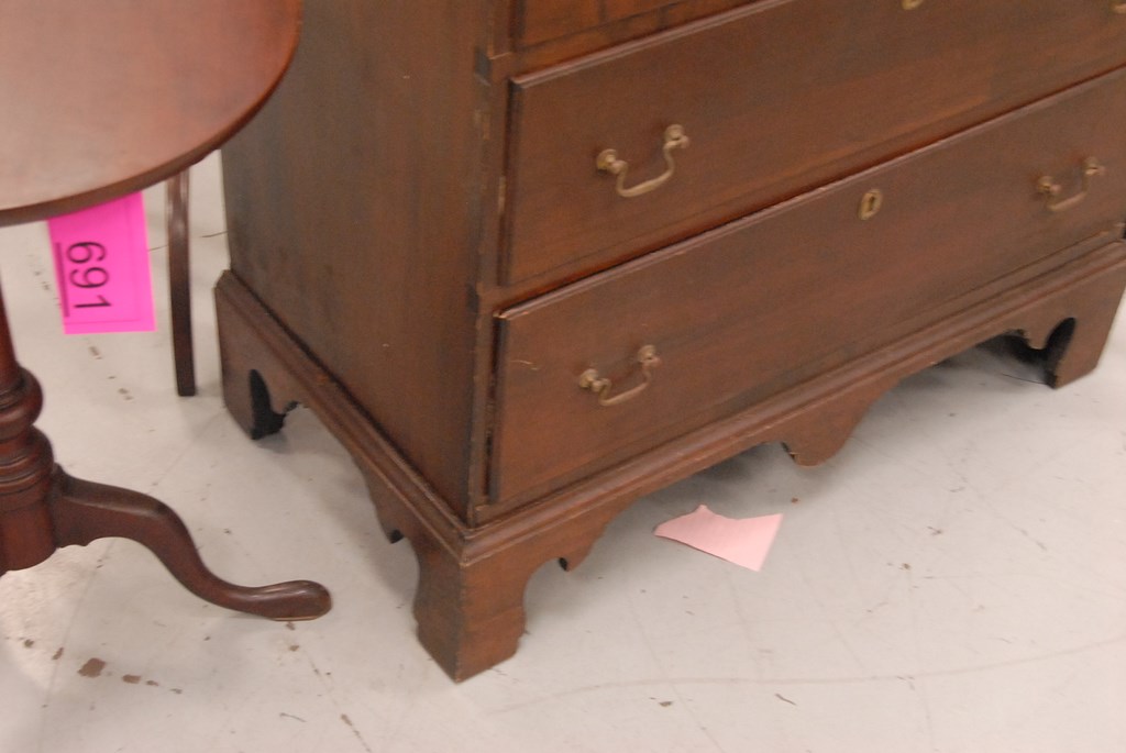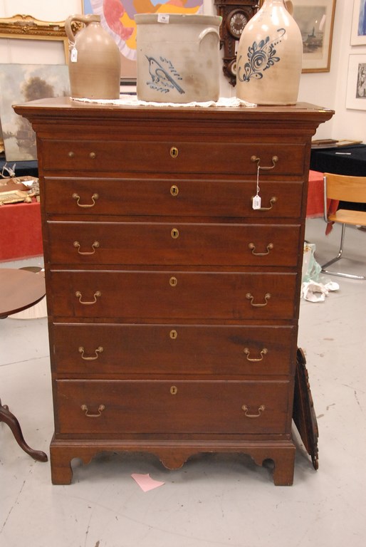 Lot 209: Cherry tall chest with large cornice molding over six long drawers on tall cut out bracket base with center drop. ht. 57in. wd. 35 …