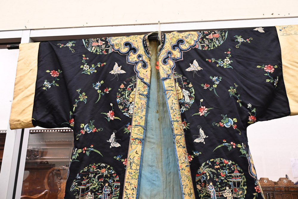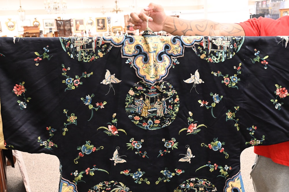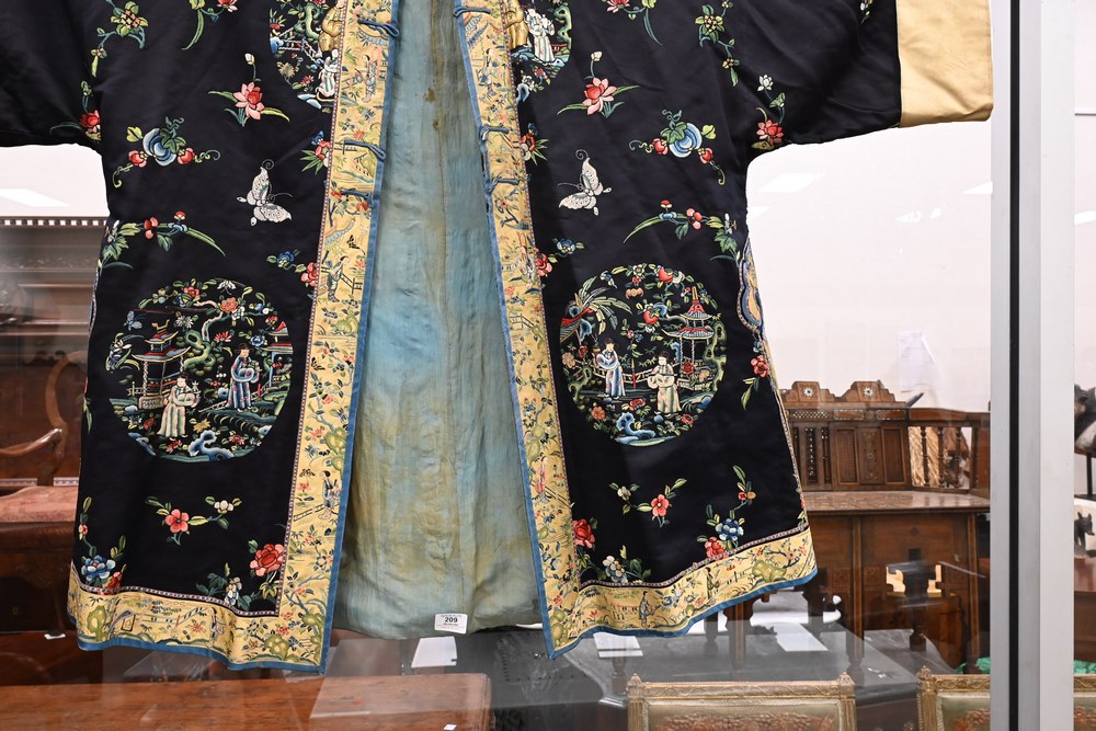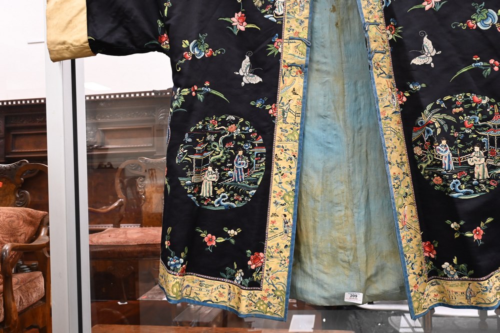 Lot 209: Chinese Silk Robe dark blue ground, having embroidered panels of figures in a courtyard, butterflies and wild flowers