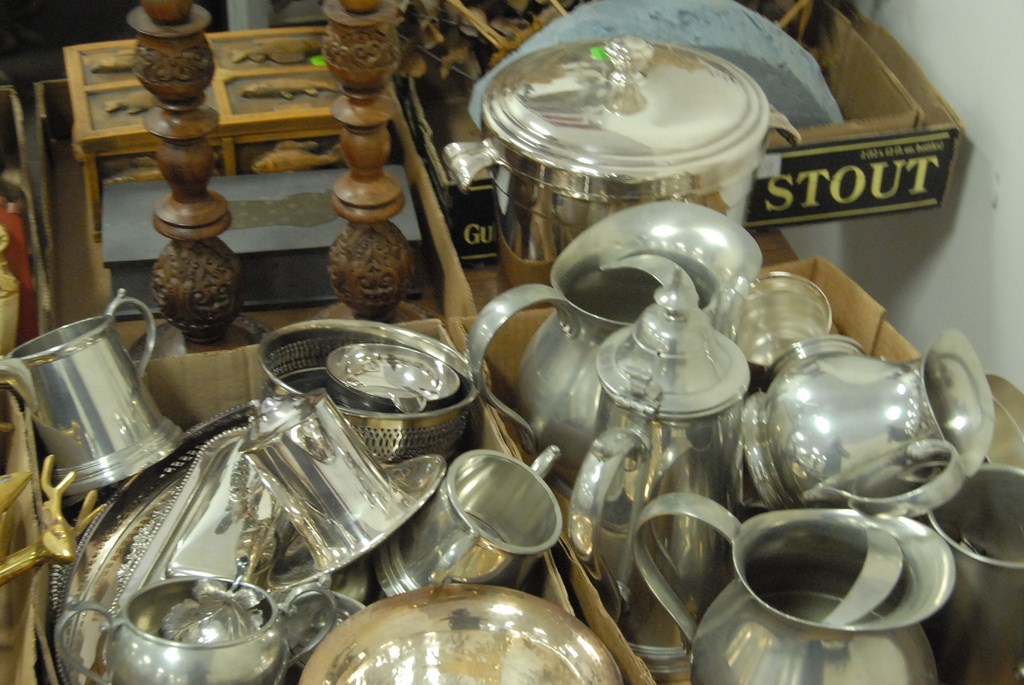 Lot 209: Eight box lots barometer desk set, pewter, silver plate, wooden candle sticks, wooden dish, two figures, brass items, etc.