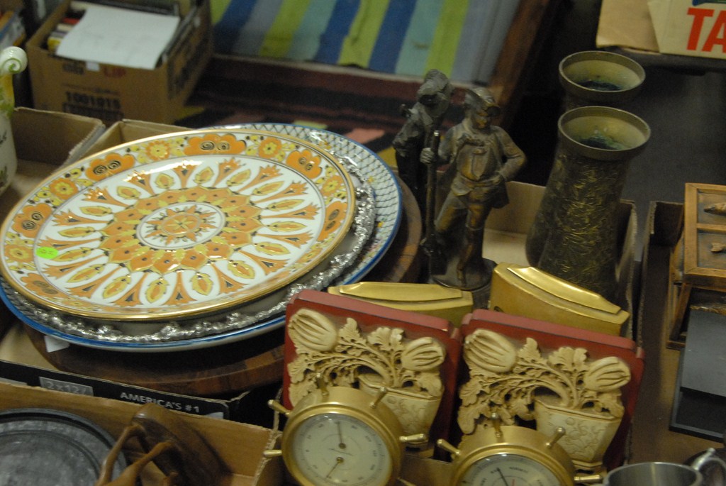 Eight box lots barometer desk set, pewter, silver plate, wooden candle sticks, wooden dish, two figures, brass items, etc.