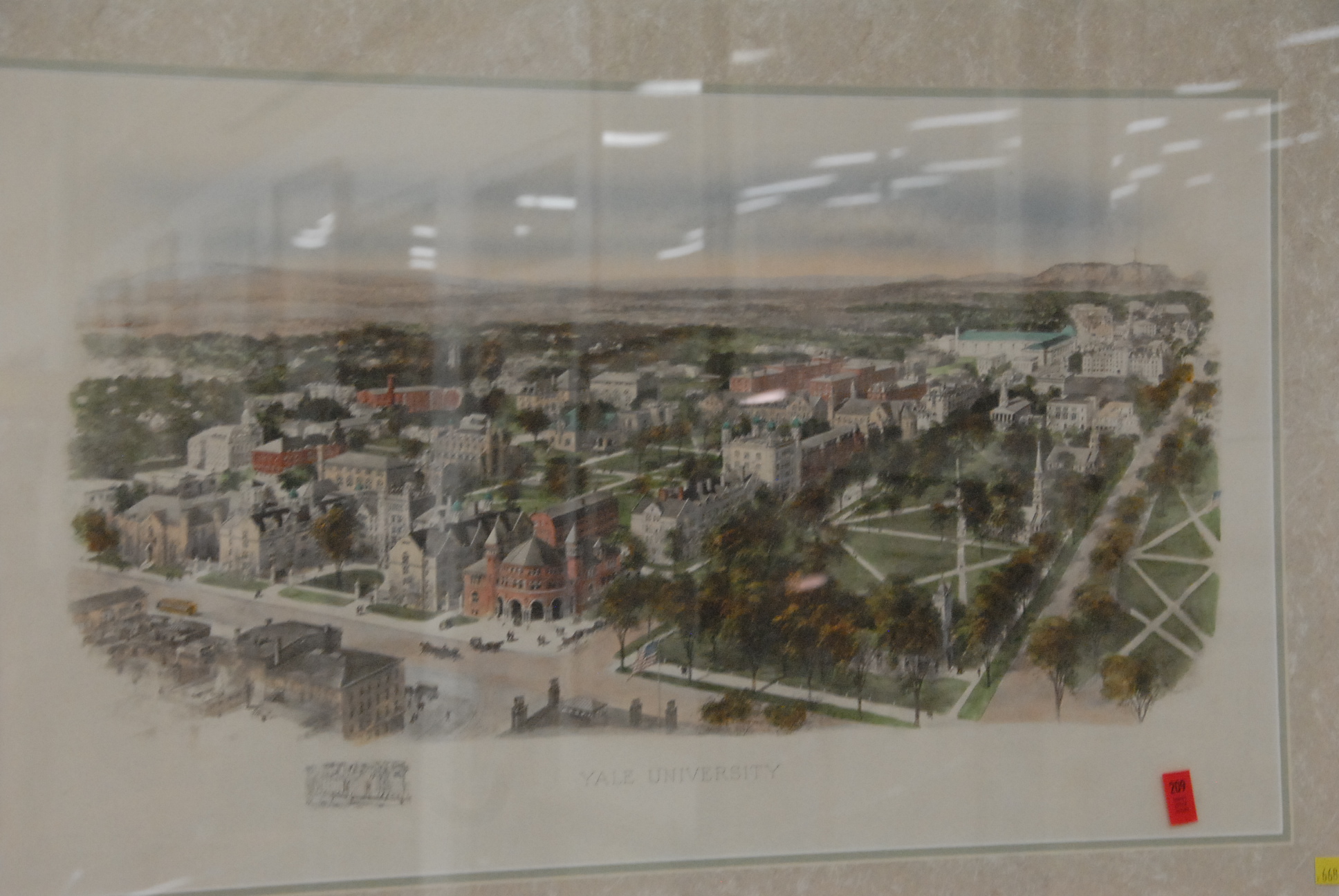 Four piece lot Yale University seal signed Colonna from ‘Yale A Portrait’, New Haven City seal signed Colonna from ‘Yale A Portrait’, birdseye view of Yale University signed in plate Rummel/Littig 1906, Yale College New Haven Connecticut The Old Brick Row with later hand coloring Harpers Weekly circa 1860, 8 1/2 x 9 1/2, 6 x 6, 6 x 7 1/2 & 18 x 31.