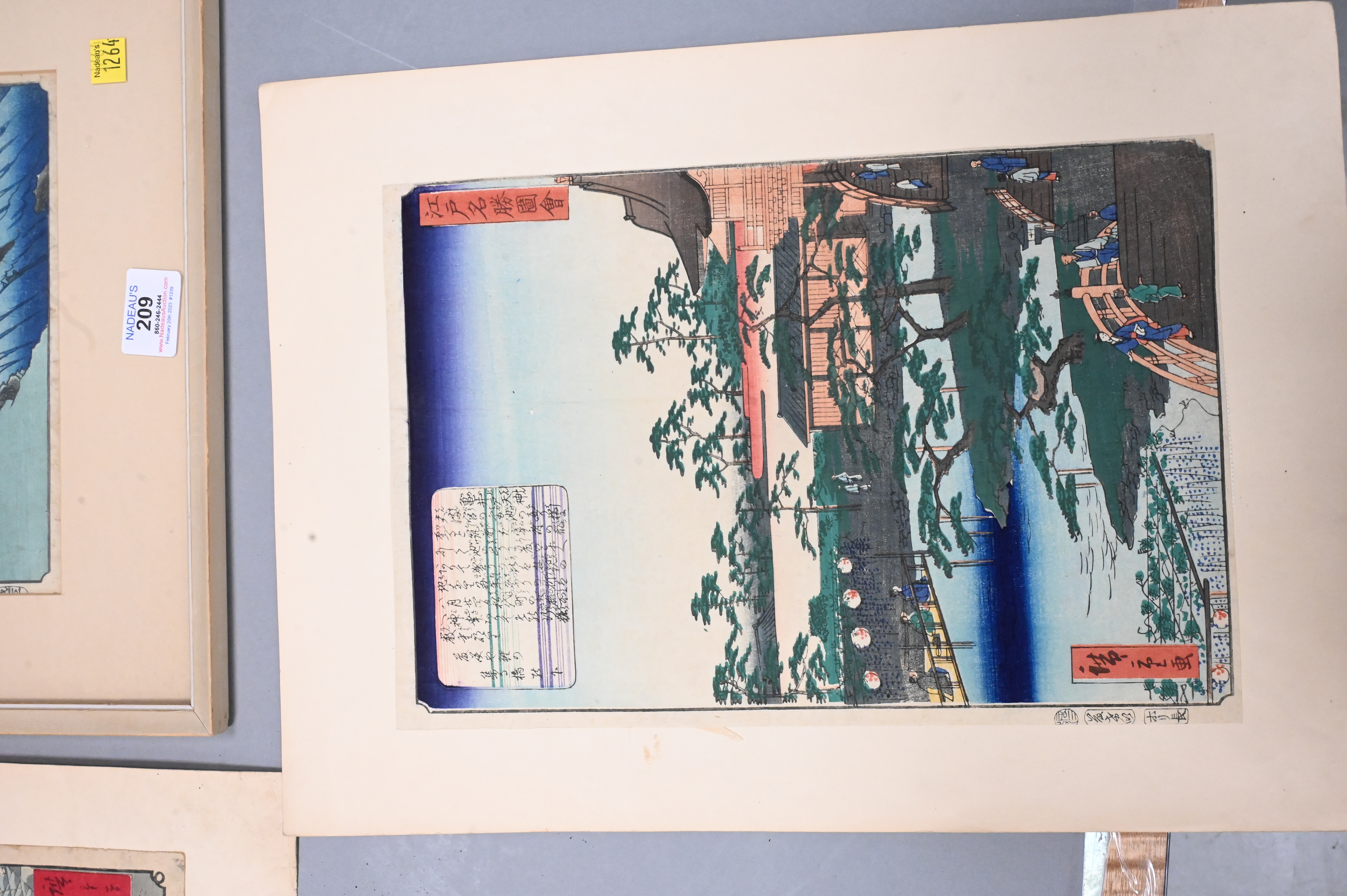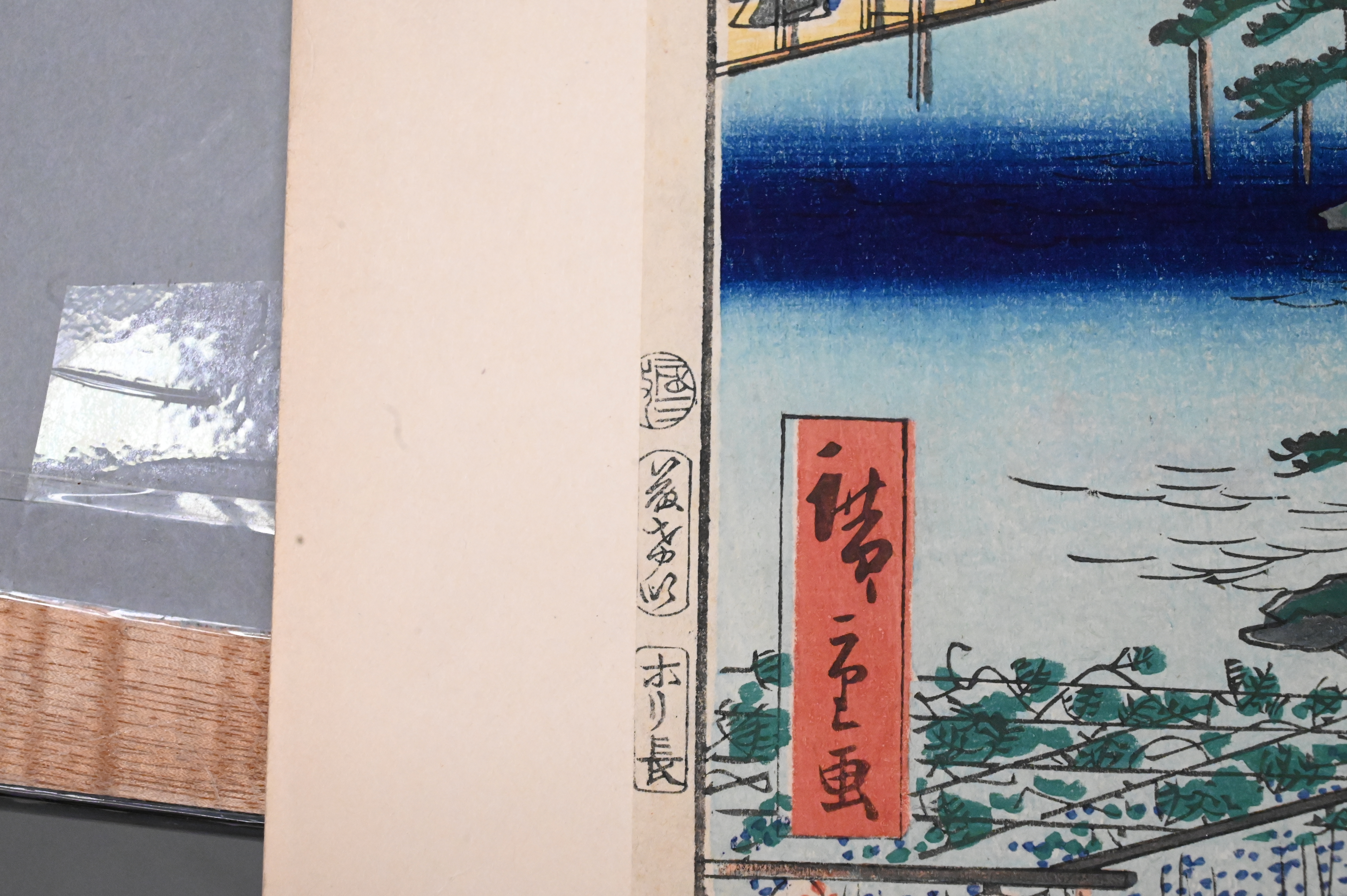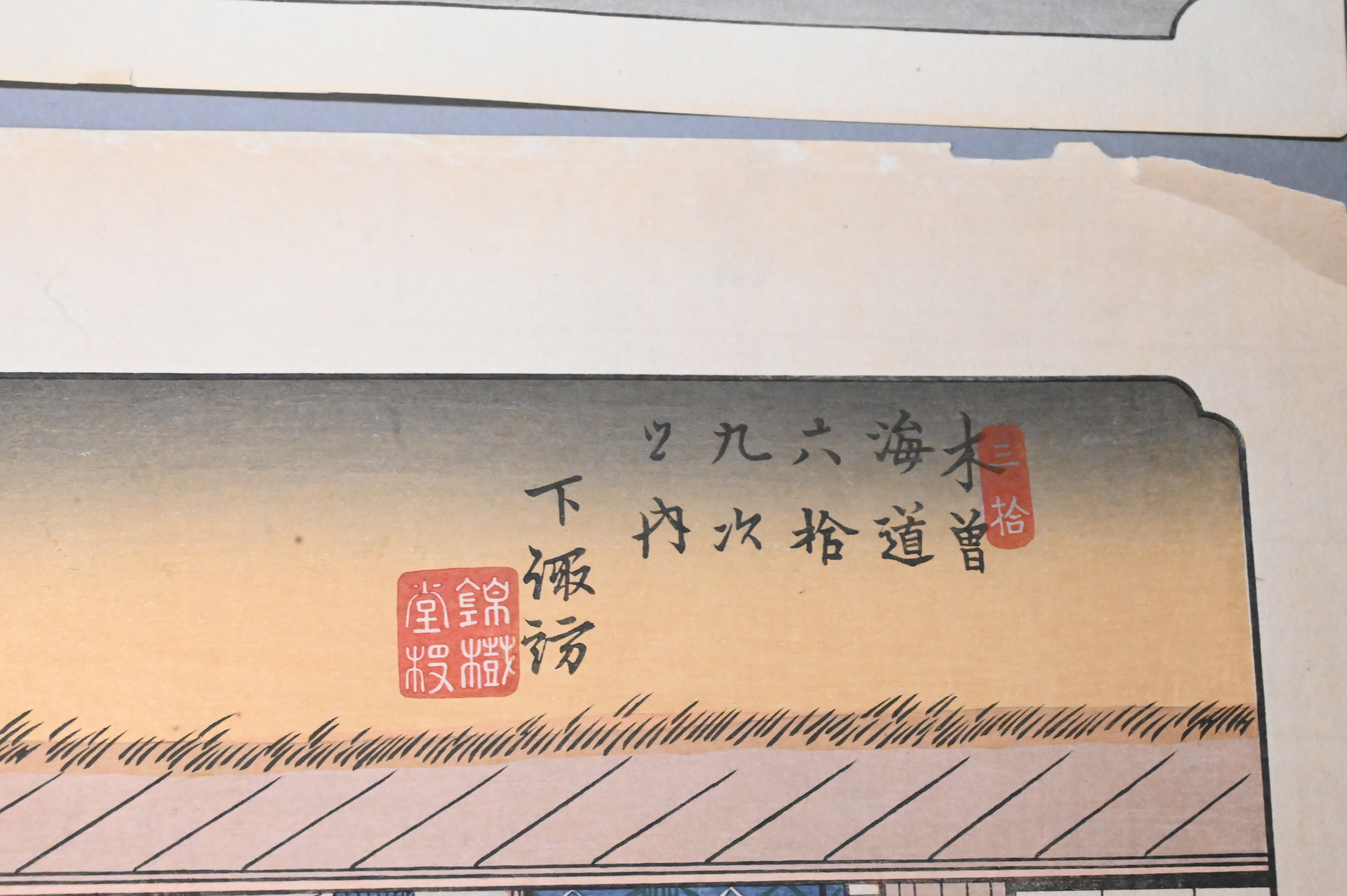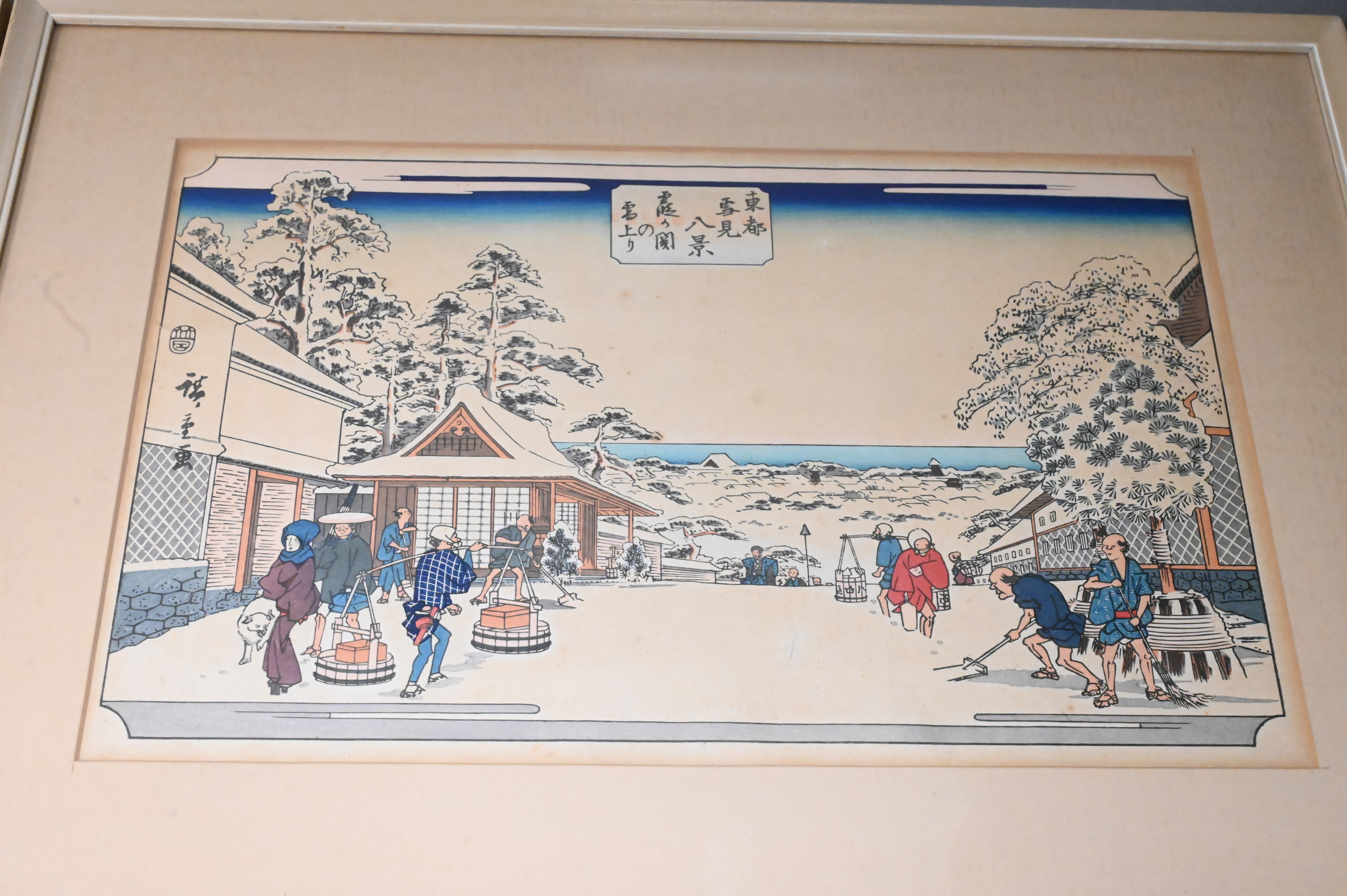 Group of Seven Japanese Woodblock Prints, after Ando Hiroshige and Utagawa Hiroshige, part of 100 famous views of Edo, Shimosuda Shukueat Hiroshige, along with two framed pieces, etc., largest 14″ x 19″.