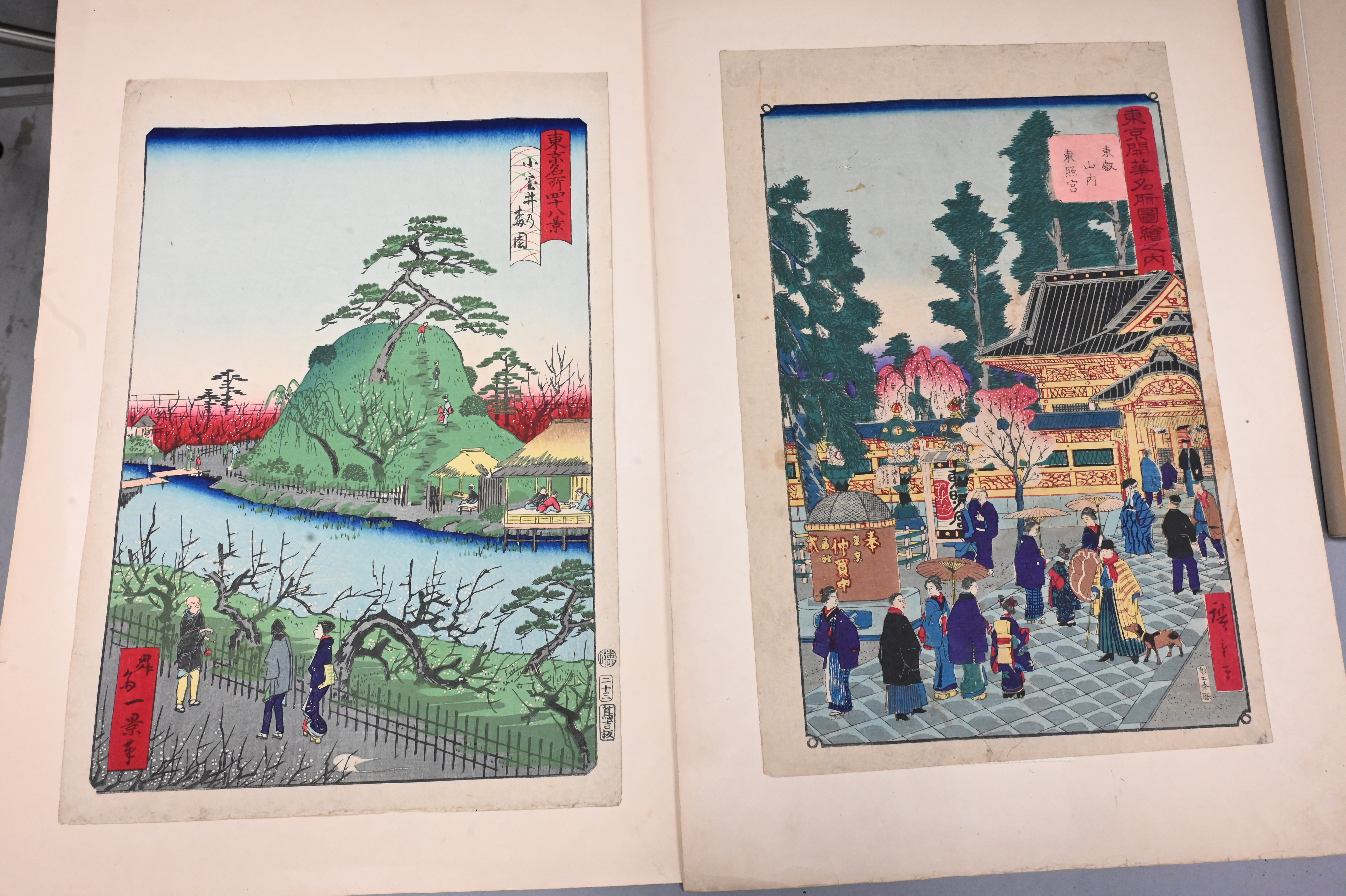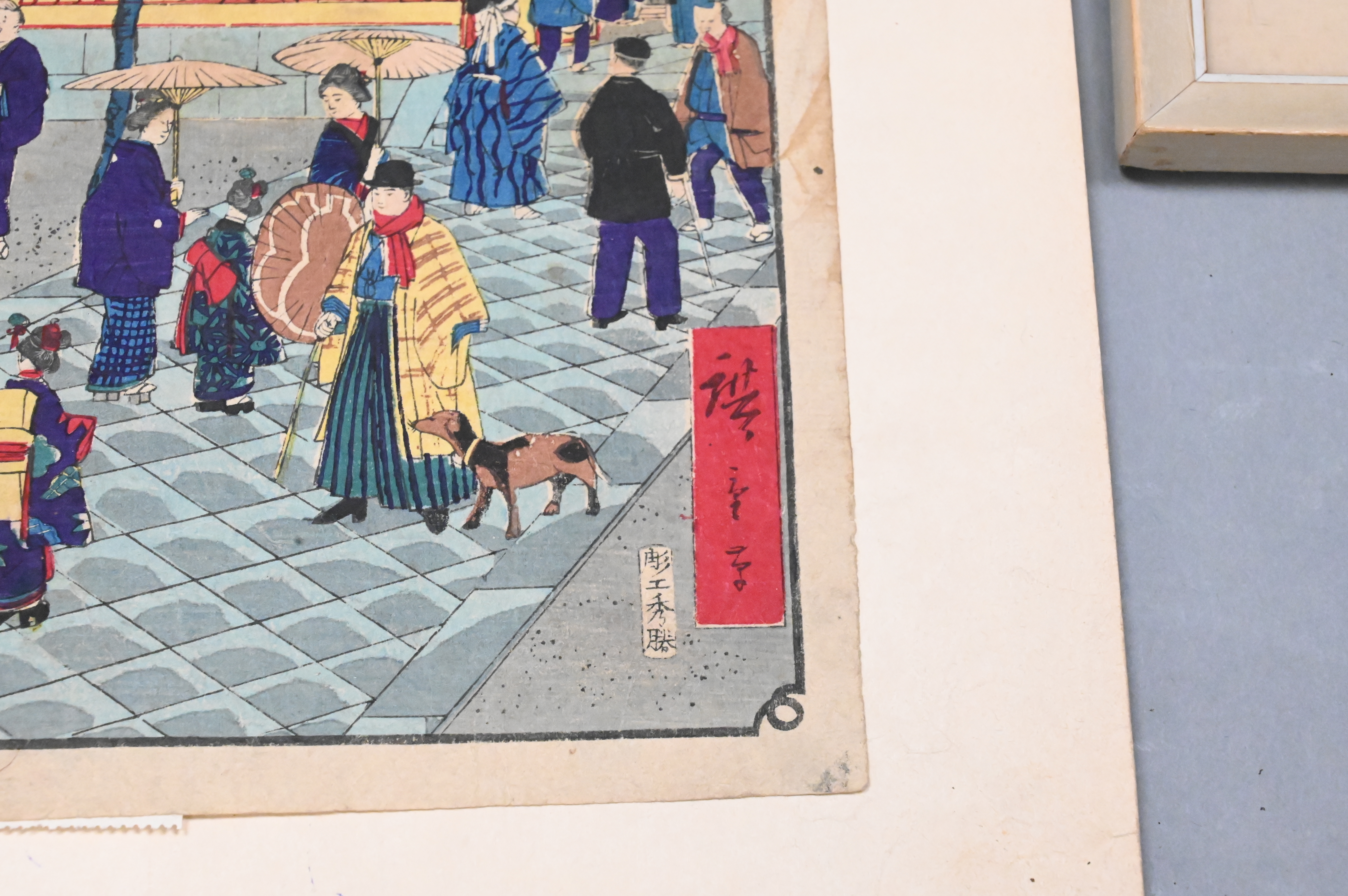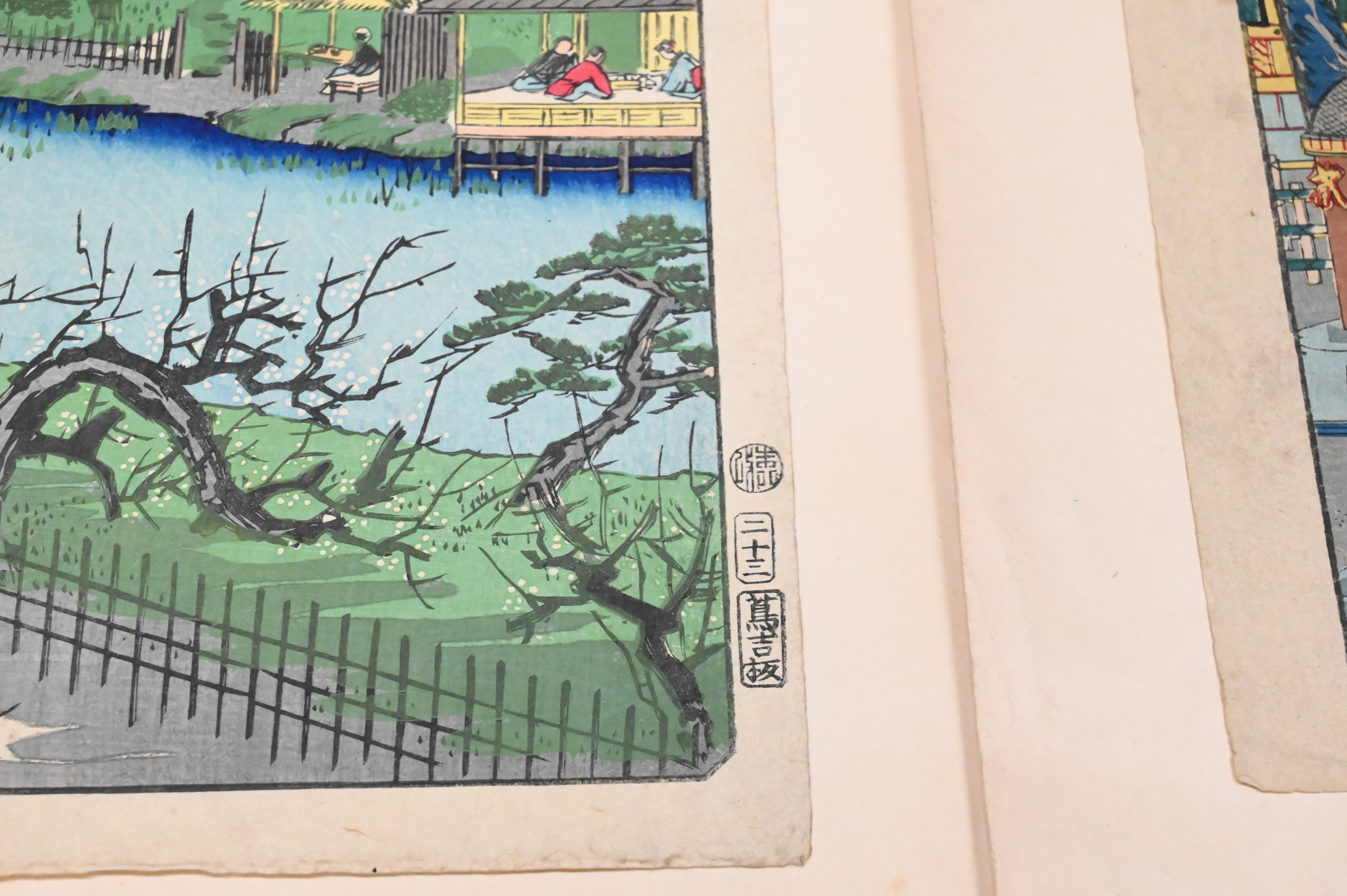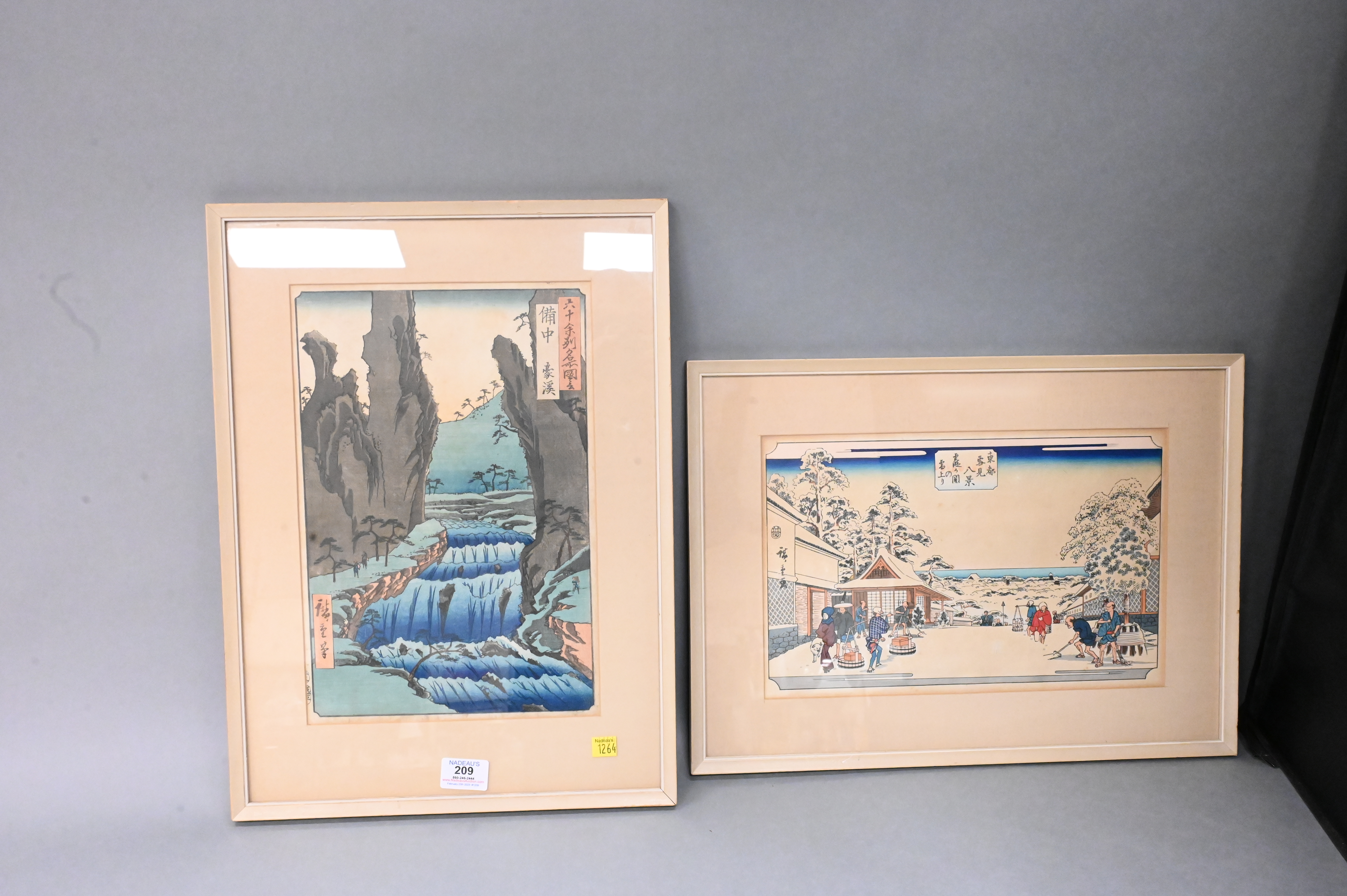 Group of Seven Japanese Woodblock Prints, after Ando Hiroshige and Utagawa Hiroshige, part of 100 famous views of Edo, Shimosuda Shukueat Hiroshige, along with two framed pieces, etc., largest 14″ x 19″.