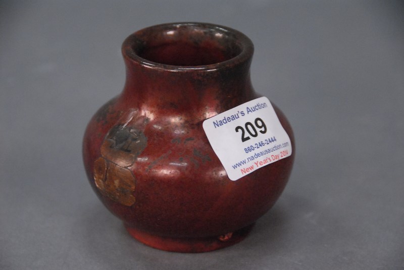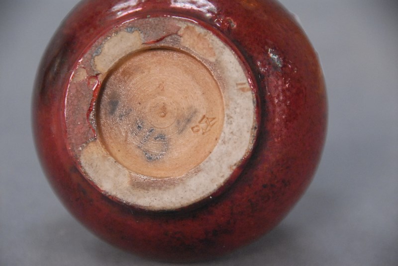 Lot 209: Hugh Robertson, Chelsea Keramic Art Works oxblood Sang de Boeuf small vase from Chelsea, Massachusetts, circa 1880, marked CKAW on base having original paper label on side. ht. 3in.