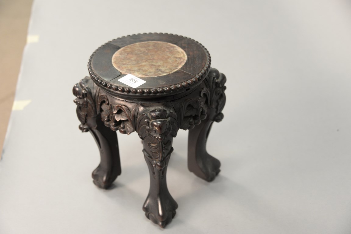 Small carved Oriental plant/vase stand with paw feet and marble insert. ht. 10 in. dia. 8 in.