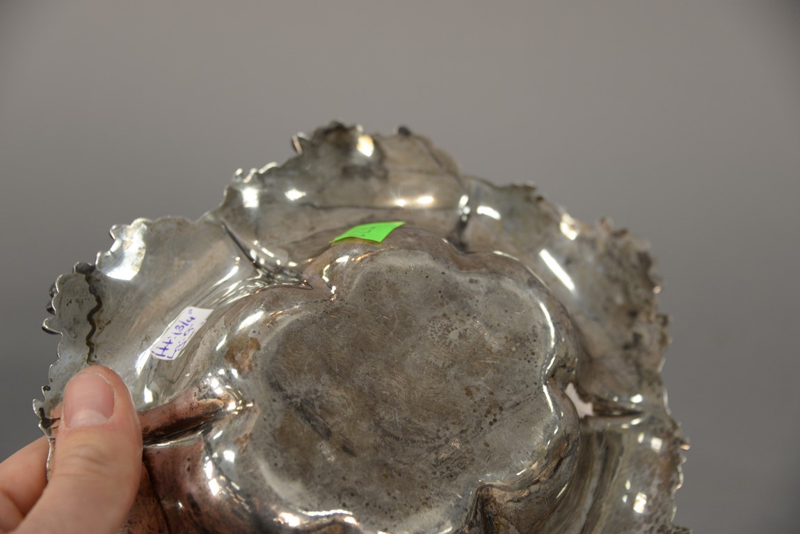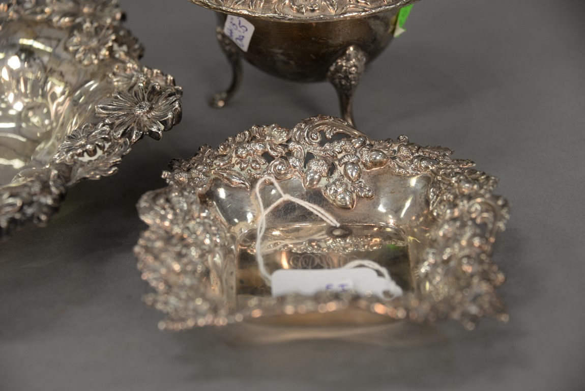 Lot 209: Three piece silver lot, each with repousse edges. lg. 5 in. to 9 in. dia. 5 in. 17.3 total t oz.