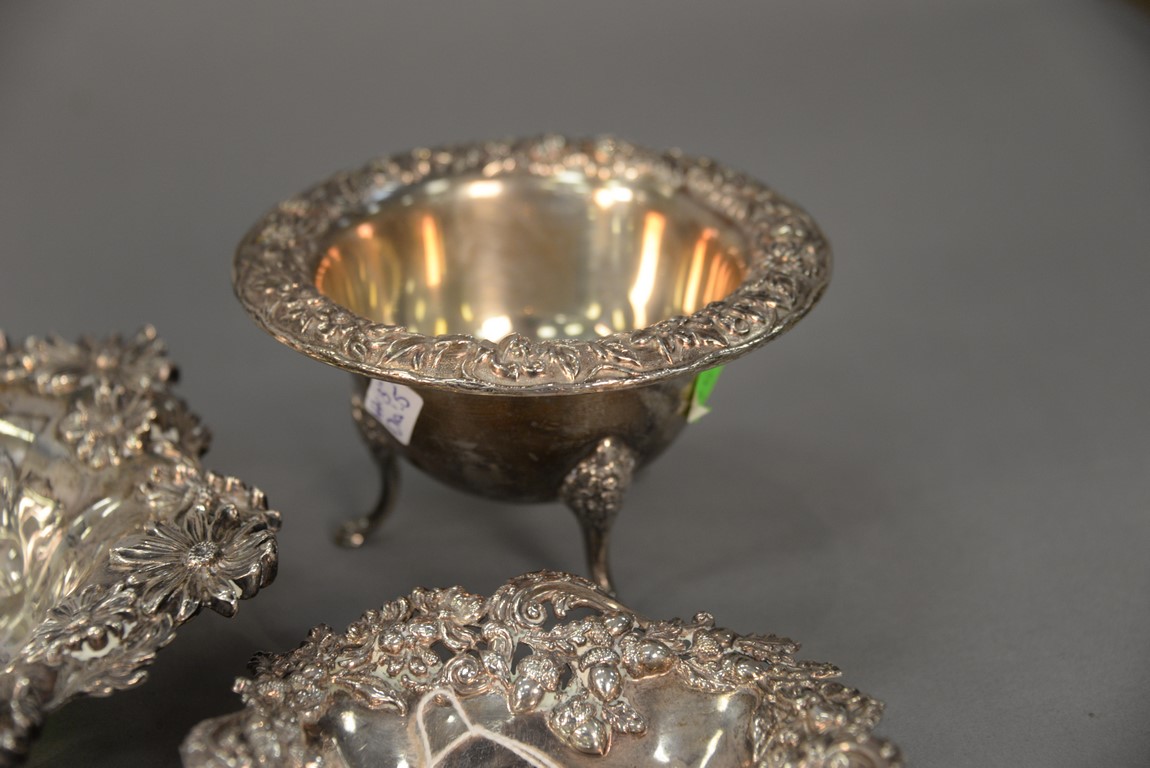 Three piece silver lot, each with repousse edges. lg. 5 in. to 9 in. dia. 5 in. 17.3 total t oz.