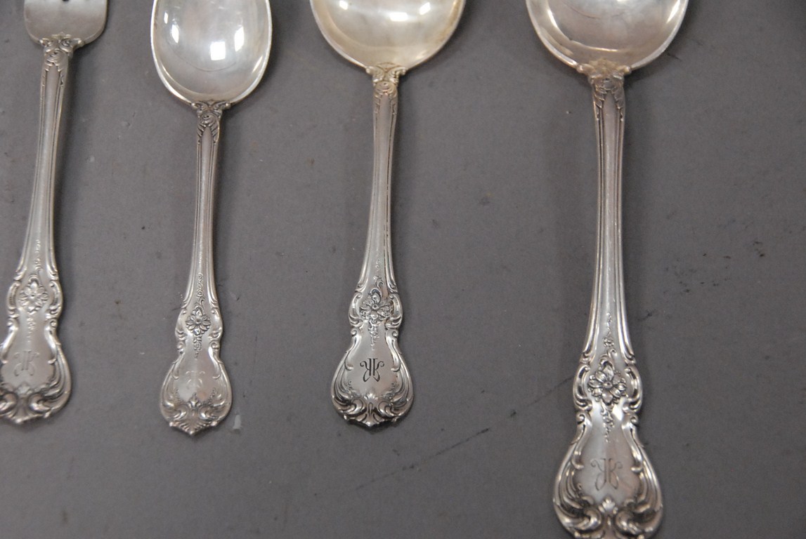 Lot 209: Towle sterling silver flatware set, setting for eight plus serving pieces, Old Master pattern, monogrammed. 54.6 t oz. of weighable …