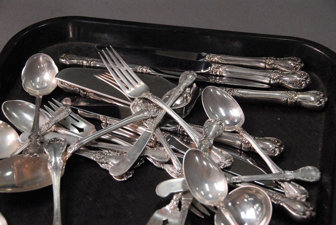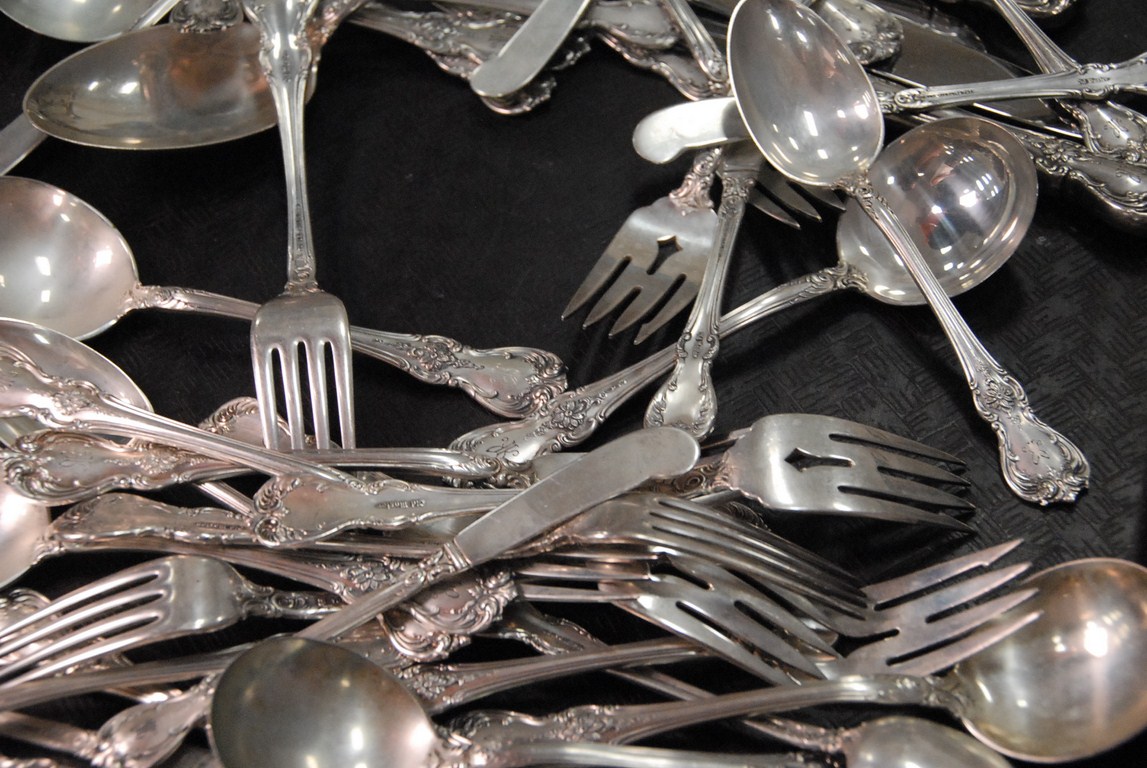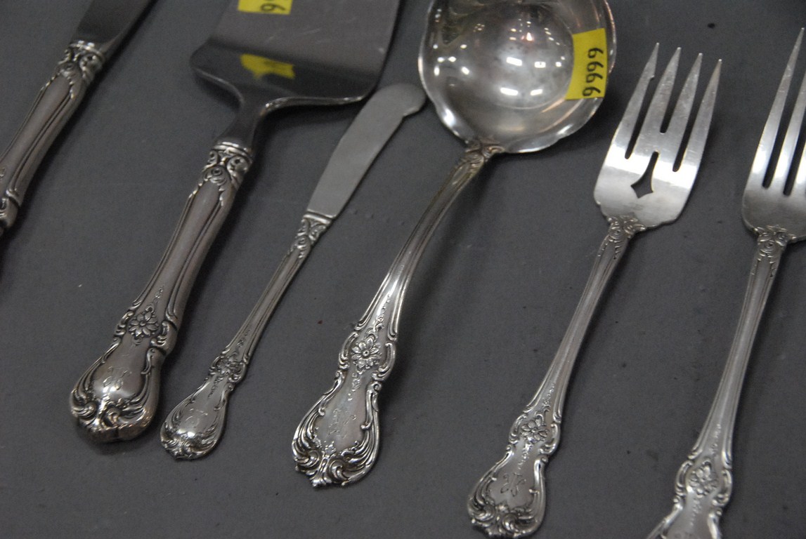 Towle sterling silver flatware set, setting for eight plus serving pieces, Old Master pattern, monogrammed. 54.6 t oz. of weighable silver plus 9 handles
