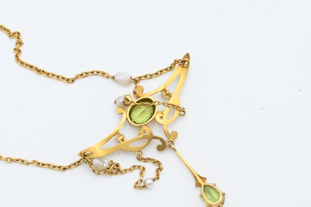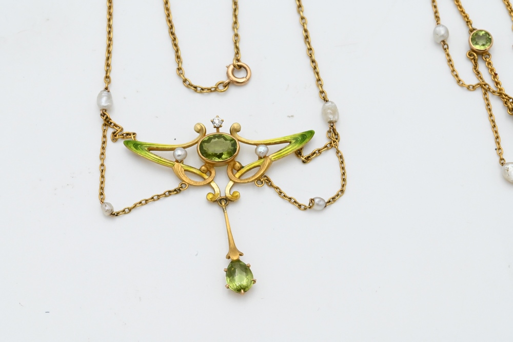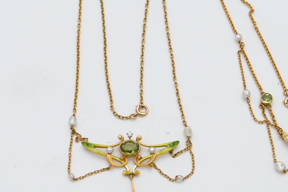 Lot 209: Two 14 Karat Gold Lavaliers, mounted with green stones, total weight 13 grams. Provenance: Louis Edmund Zacher, President of Travele…