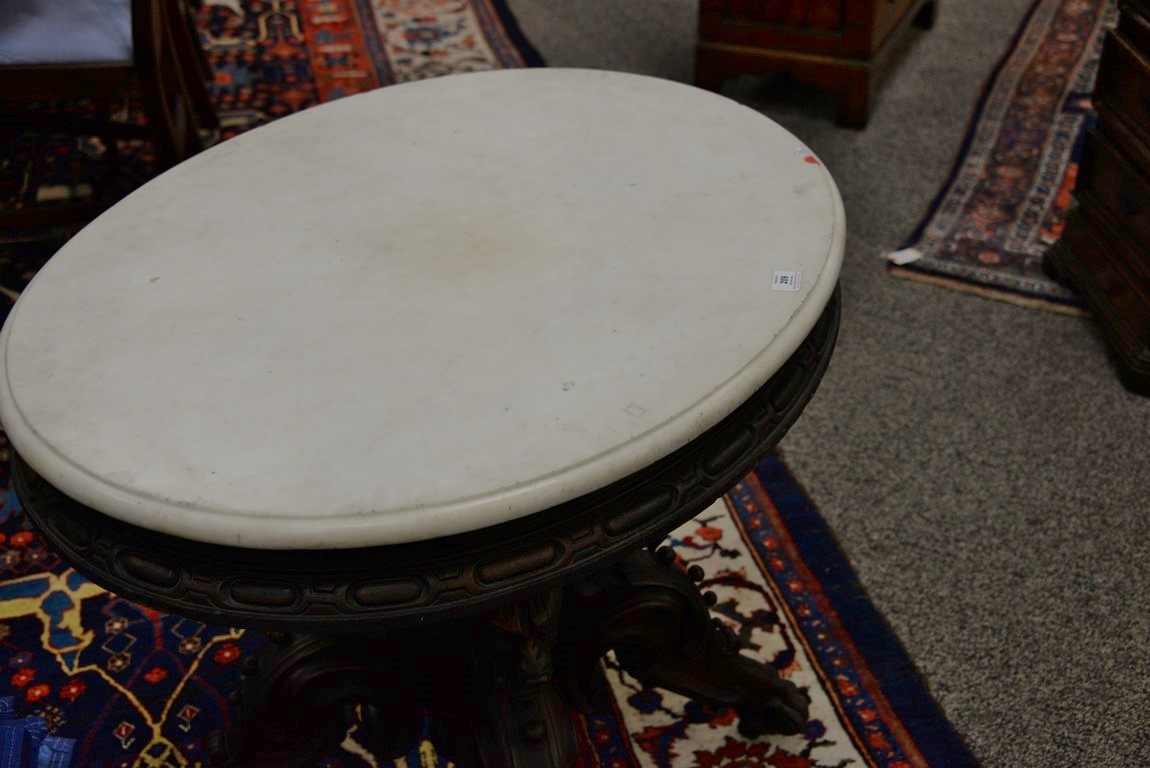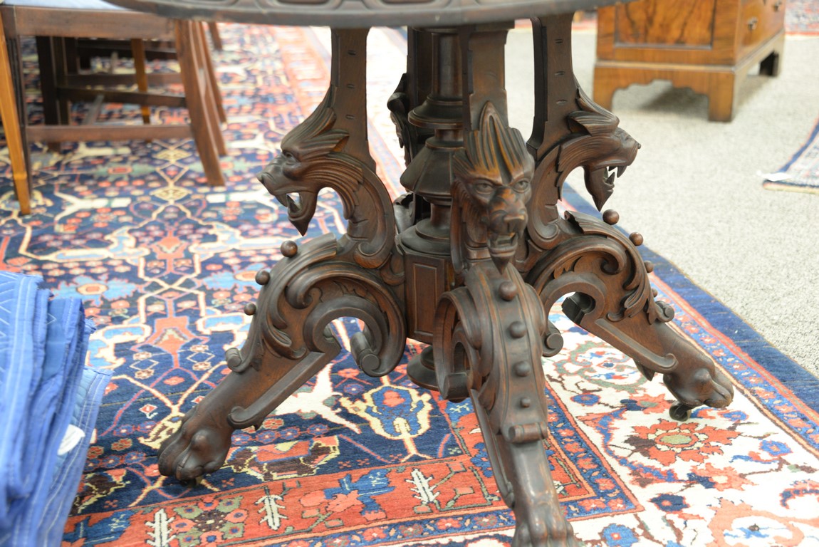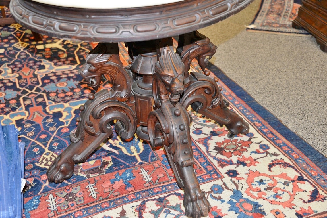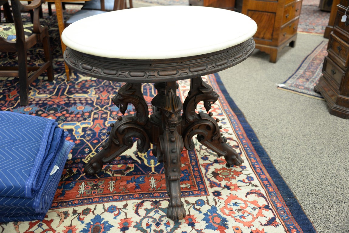 Lot 209: Victorian walnut table with oval marble top on carved base with gargoyle heads set on carved legs ending in paw feet. ht. 31 in. t…