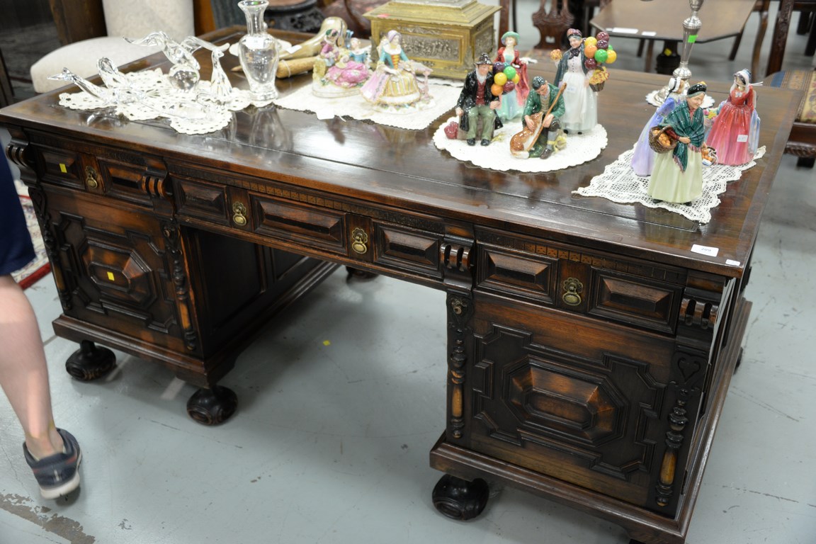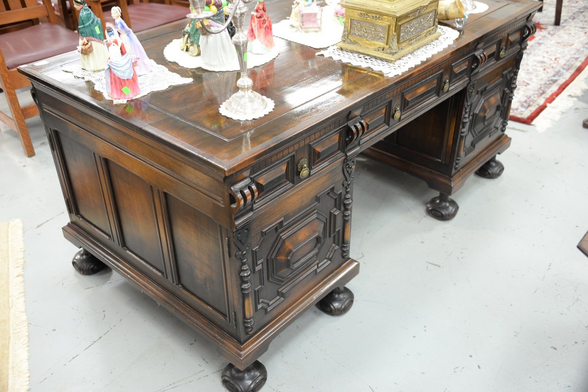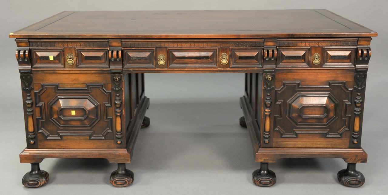 Lot 209: Walnut executive partner’s kneehole desk, Jacobean style, early 20th century. ht. 30 1/2 in. top: 35 x 66