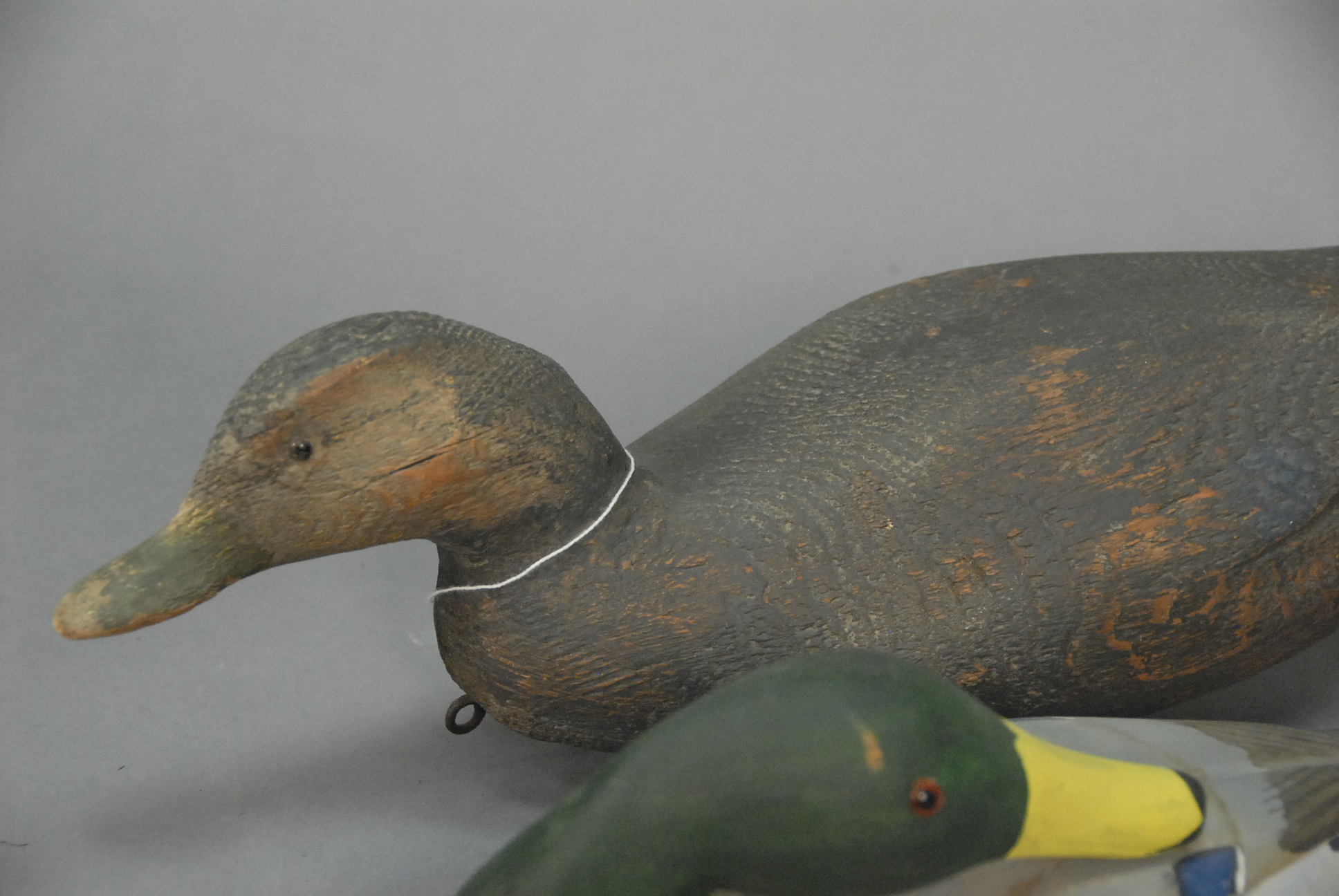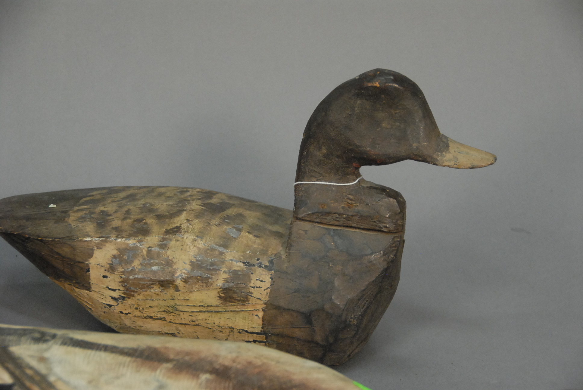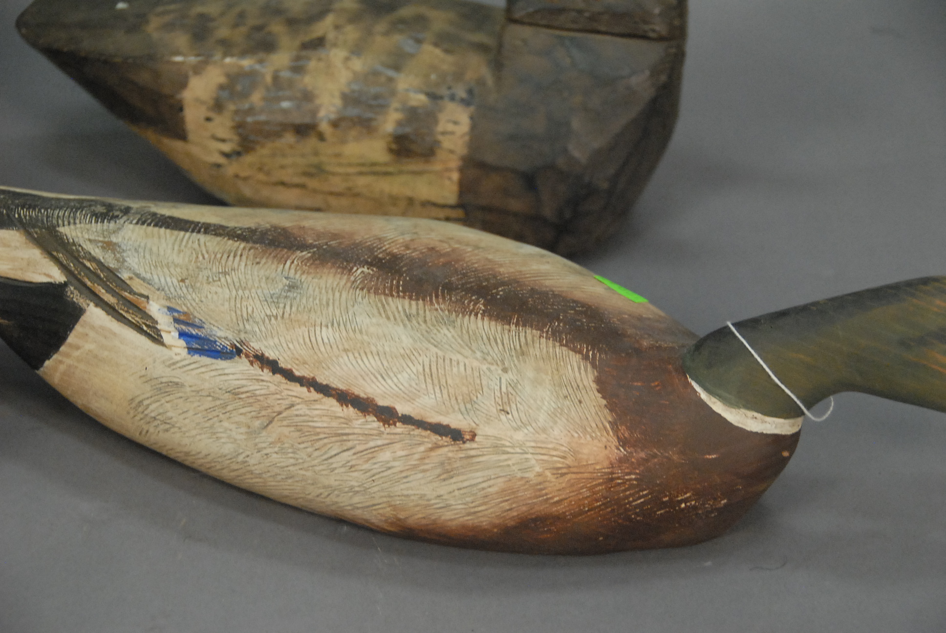 Lot 209B: Four decoys to include a mallard decoy marked in pencil Oliver LaPlace 1983, an Assabet River marked WEK Will Kirkpatrick, and two unmarked.
