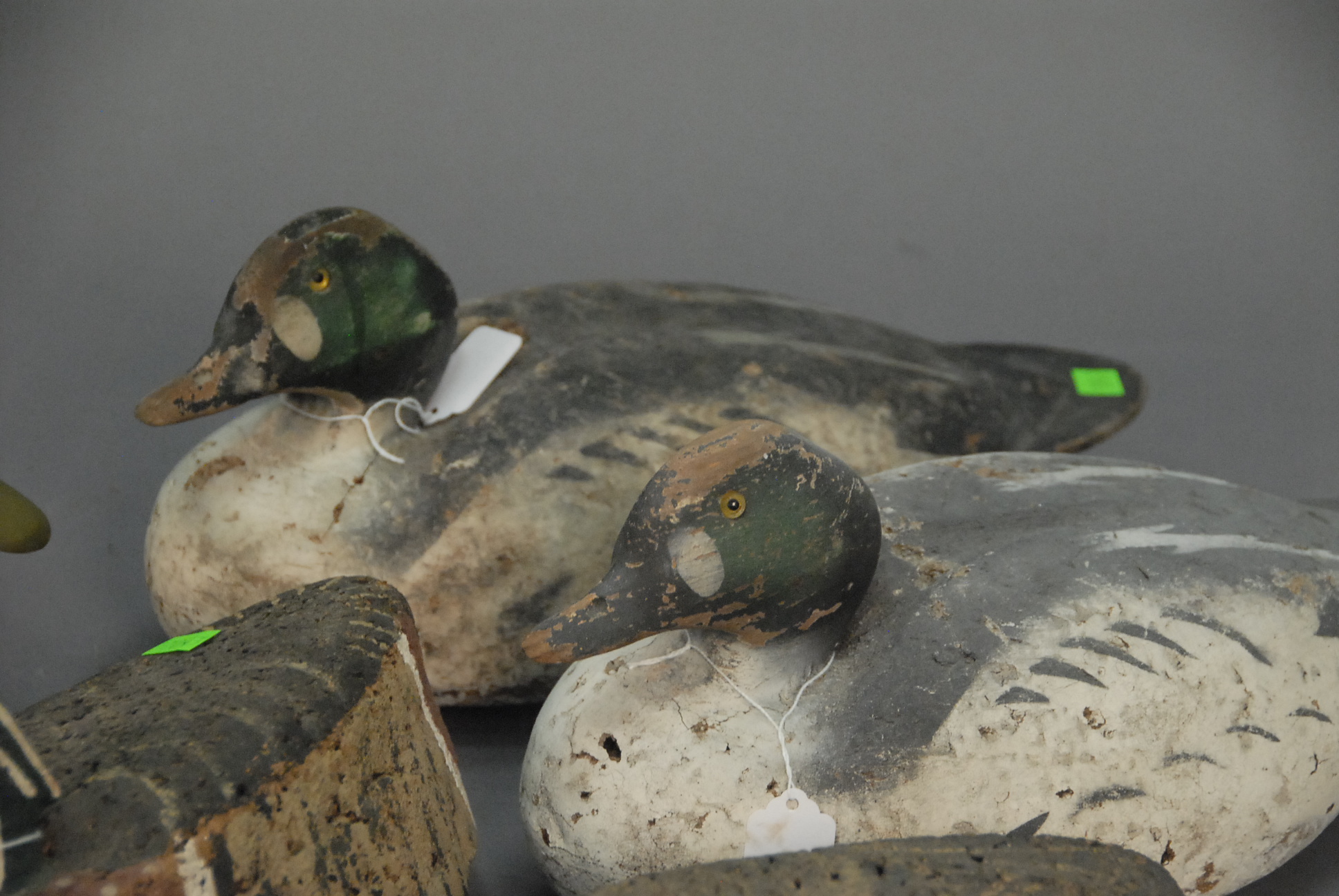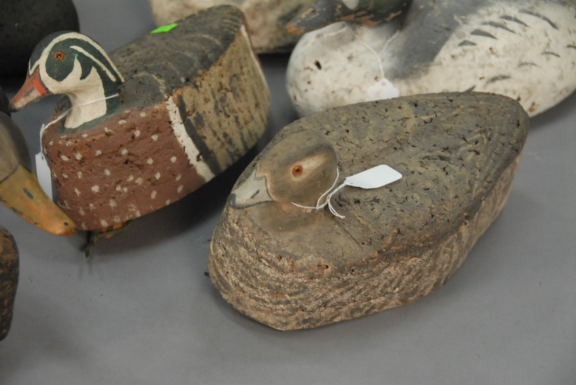 Lot 209F: Group of seven cork duck decoys to include pair of wood ducks, pair of mallard, etc.