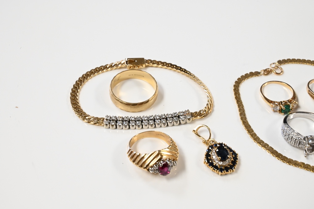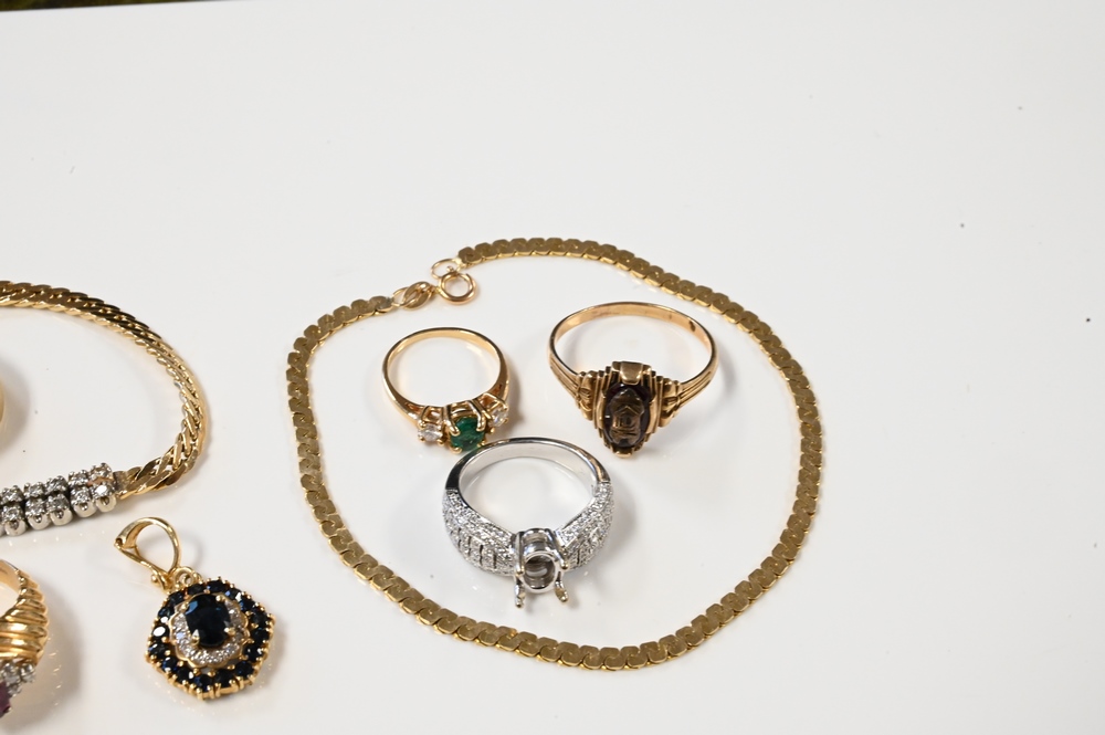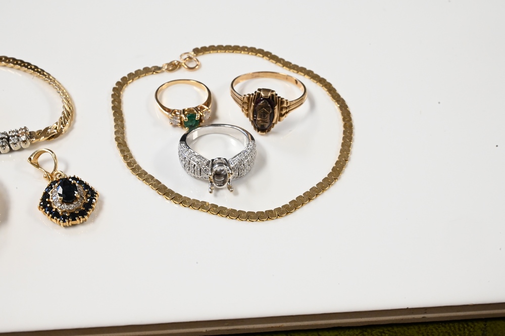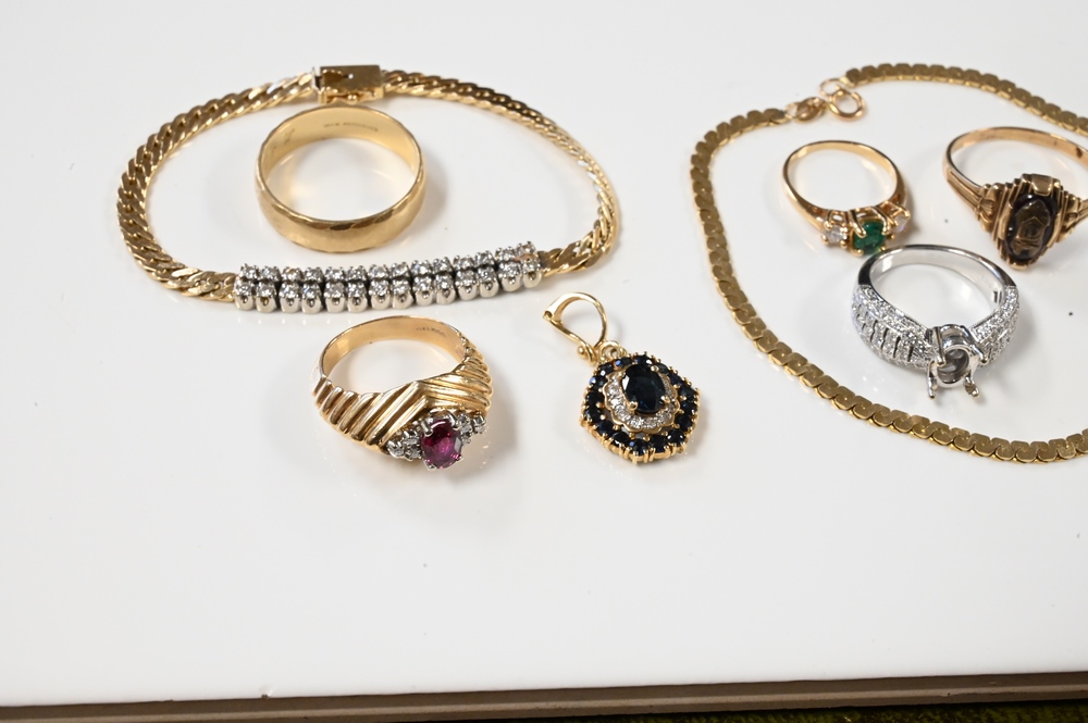 Gold Lot, to include 14K bracelet mounted with diamonds, 14K flat bracelet, 14K white gold ring setting with small diamonds, along with four additional gold rings and a pendant, 39.98 grams of which 3.9 grams is 10K.