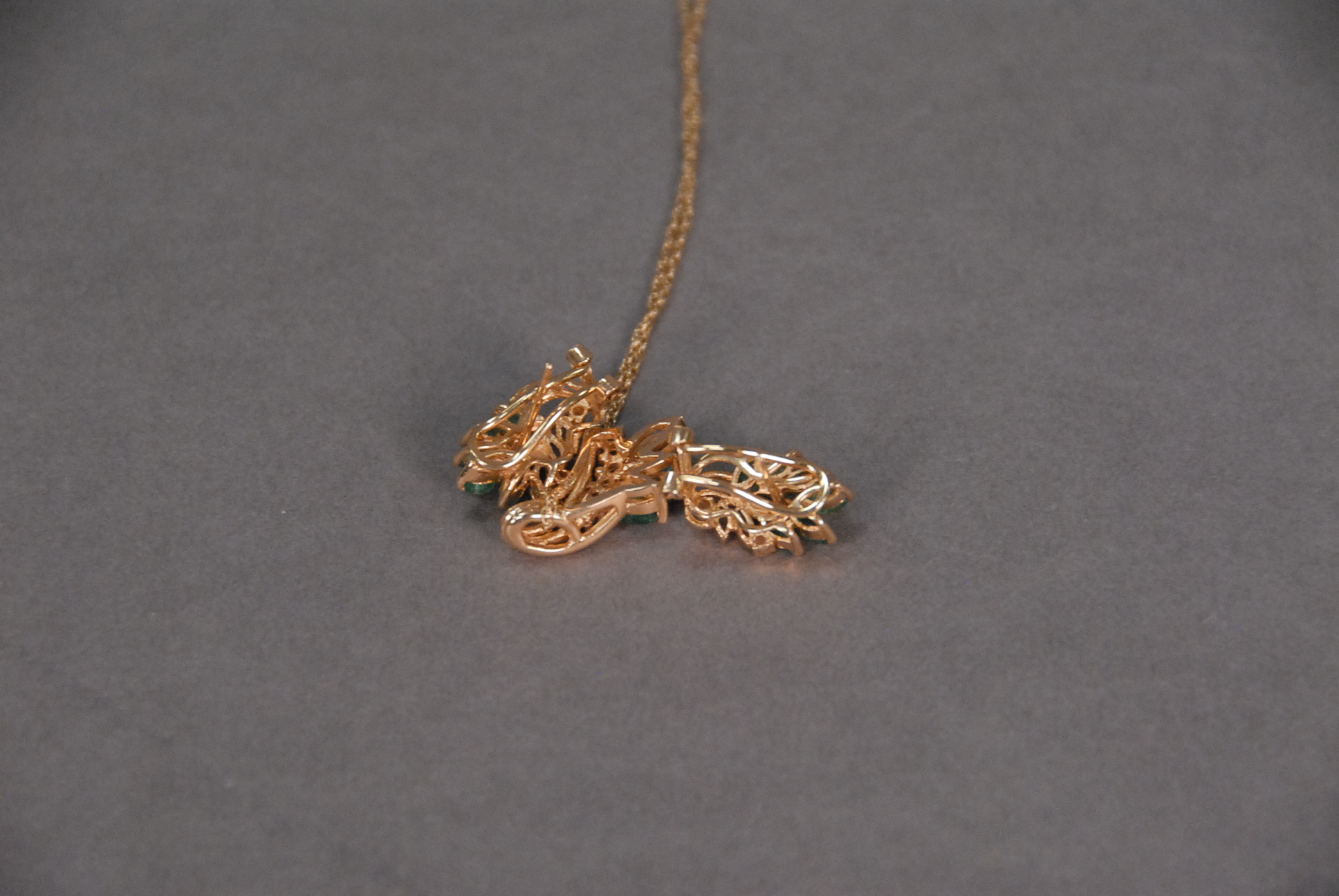 Lot 21: 14K gold three piece set to include pendant set with emeralds on 14K gold chain and pair of 14K gold earrings set with emeralds and …