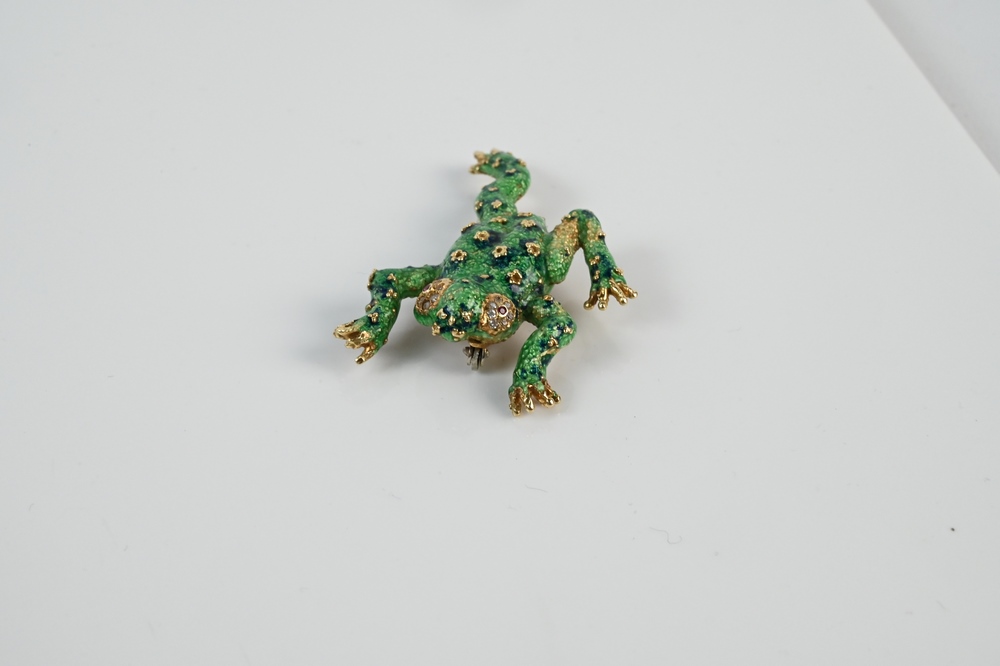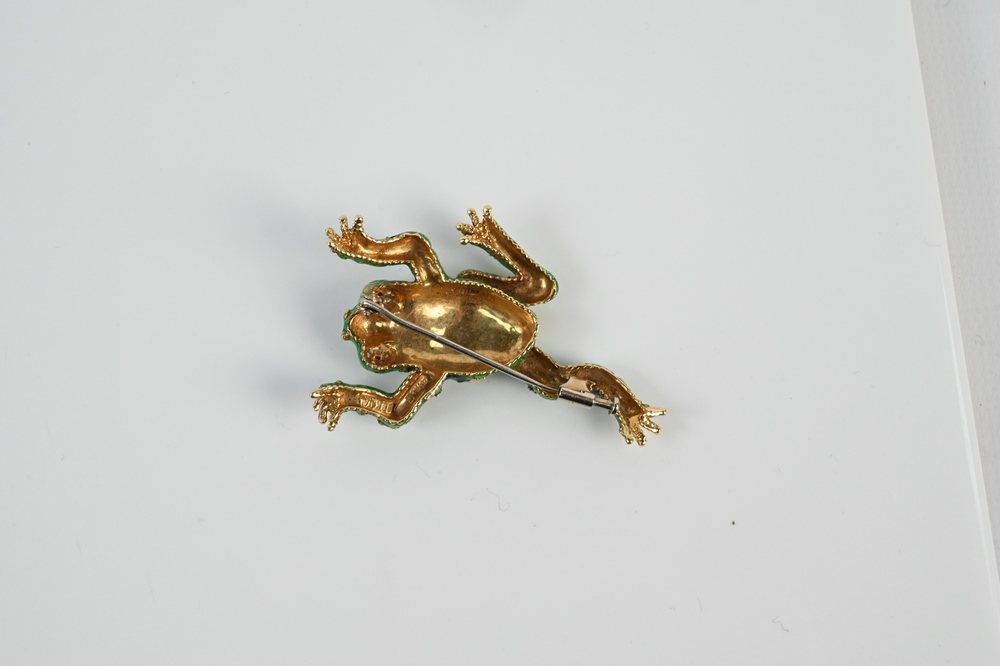 Lot 21: 18 Karat Gold Frog Brooch, enameled green and red eyes, some chips in enameling, length 1 7/8 inches, 12.8 grams.