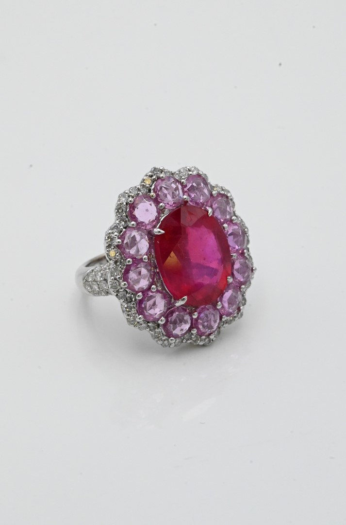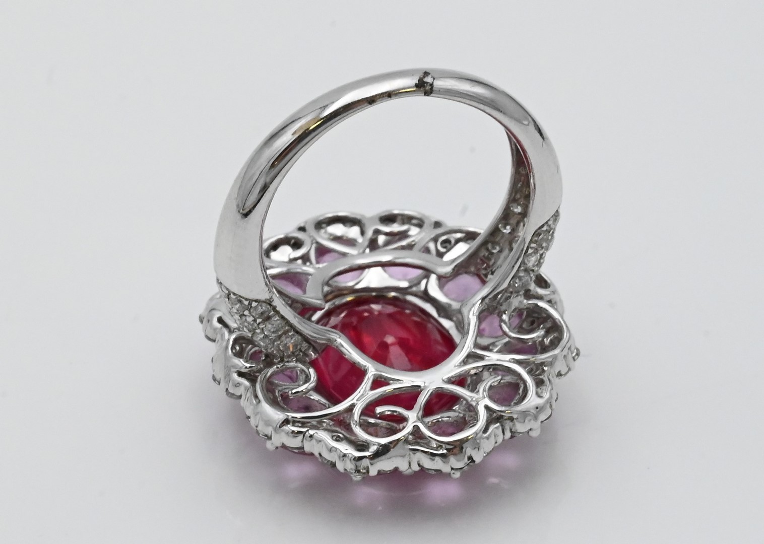 18 Karat White Gold Cocktail Ring, having shaped oval form top, oval red stone 11 x 13 millimeters, surrounded by light pink stones, surrounded by diamonds, size 6 1/2, 11.7 grams total weight.