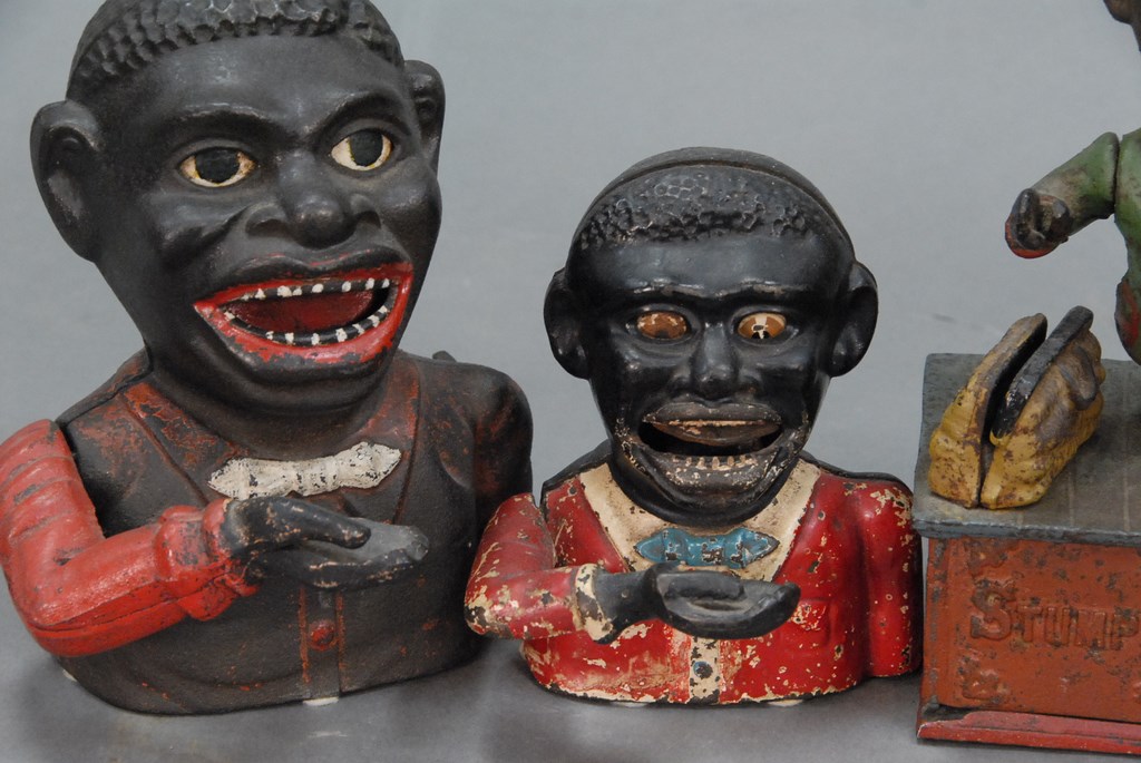 Black memorabilia grouping of four mechanical banks, one is aluminum and one is Stump Speaker.