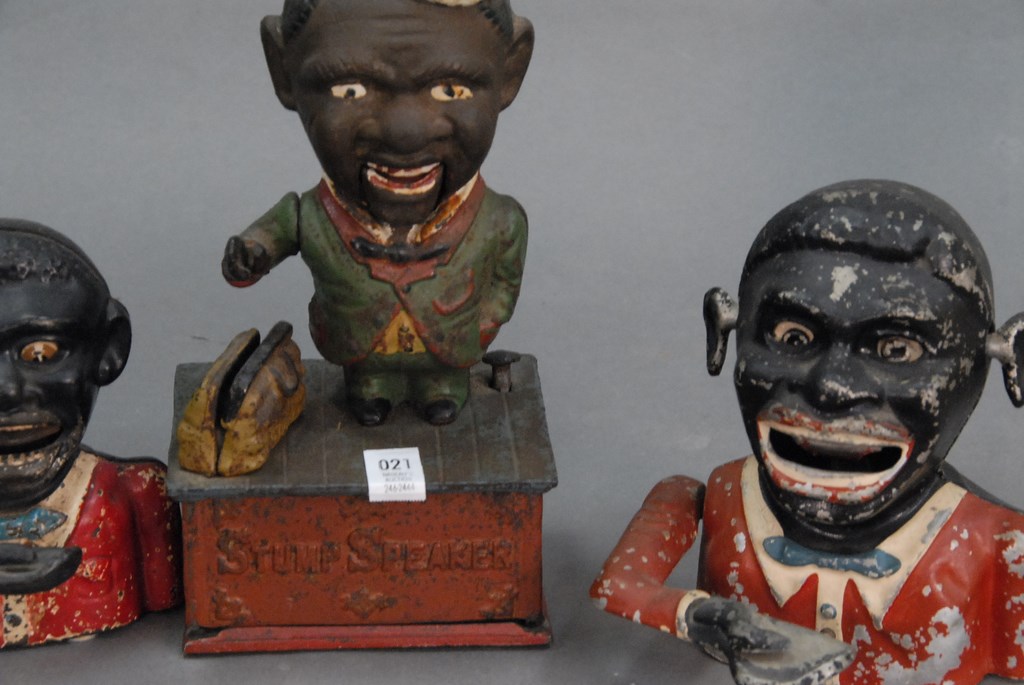 Lot 21: Black memorabilia grouping of four mechanical banks, one is aluminum and one is Stump Speaker.