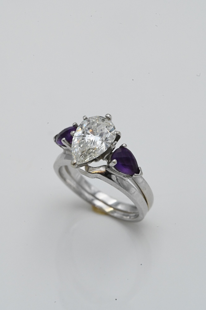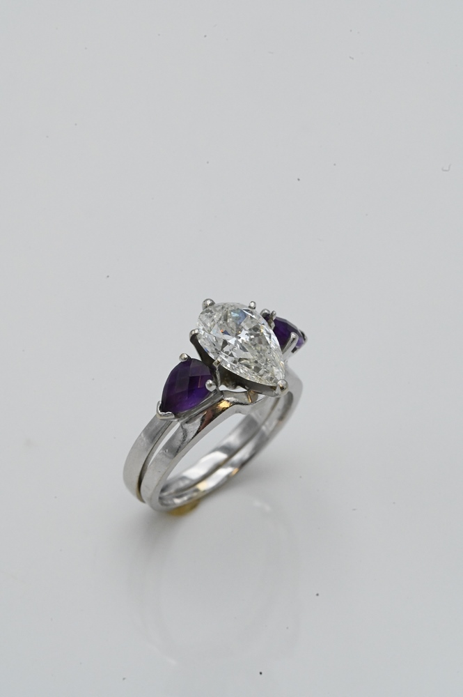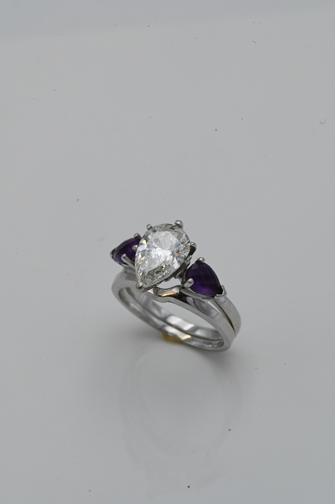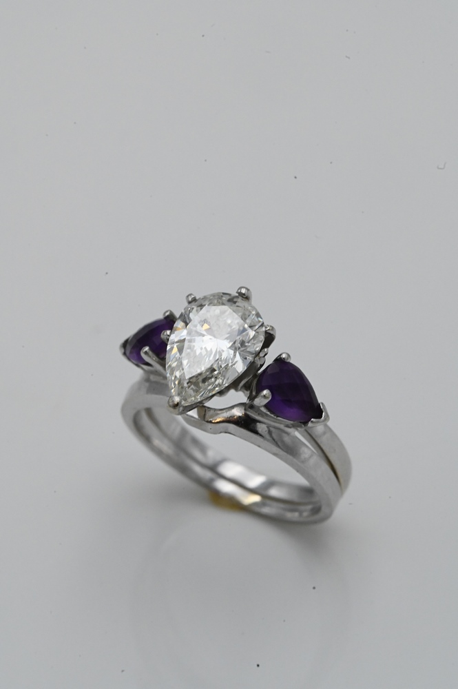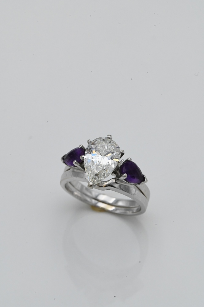 Lot 21: Diamond Engagement Ring, in two parts with center 3.4 carat pear shaped diamond, I color, clarity SI2, having band mounted with two pear shaped amethyst, size 9 1/4, GIA certificate included.
