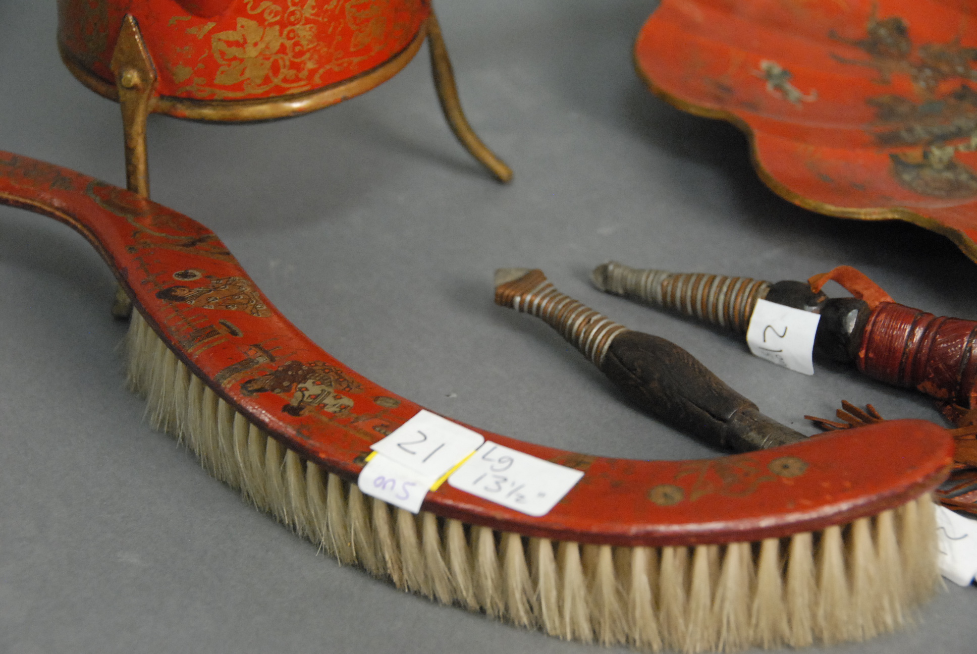 Five piece Oriental group to include a red lacquered shell shaped dish 12in., brush lg. 13 1/2in., red painted tin teapot, and two knives.