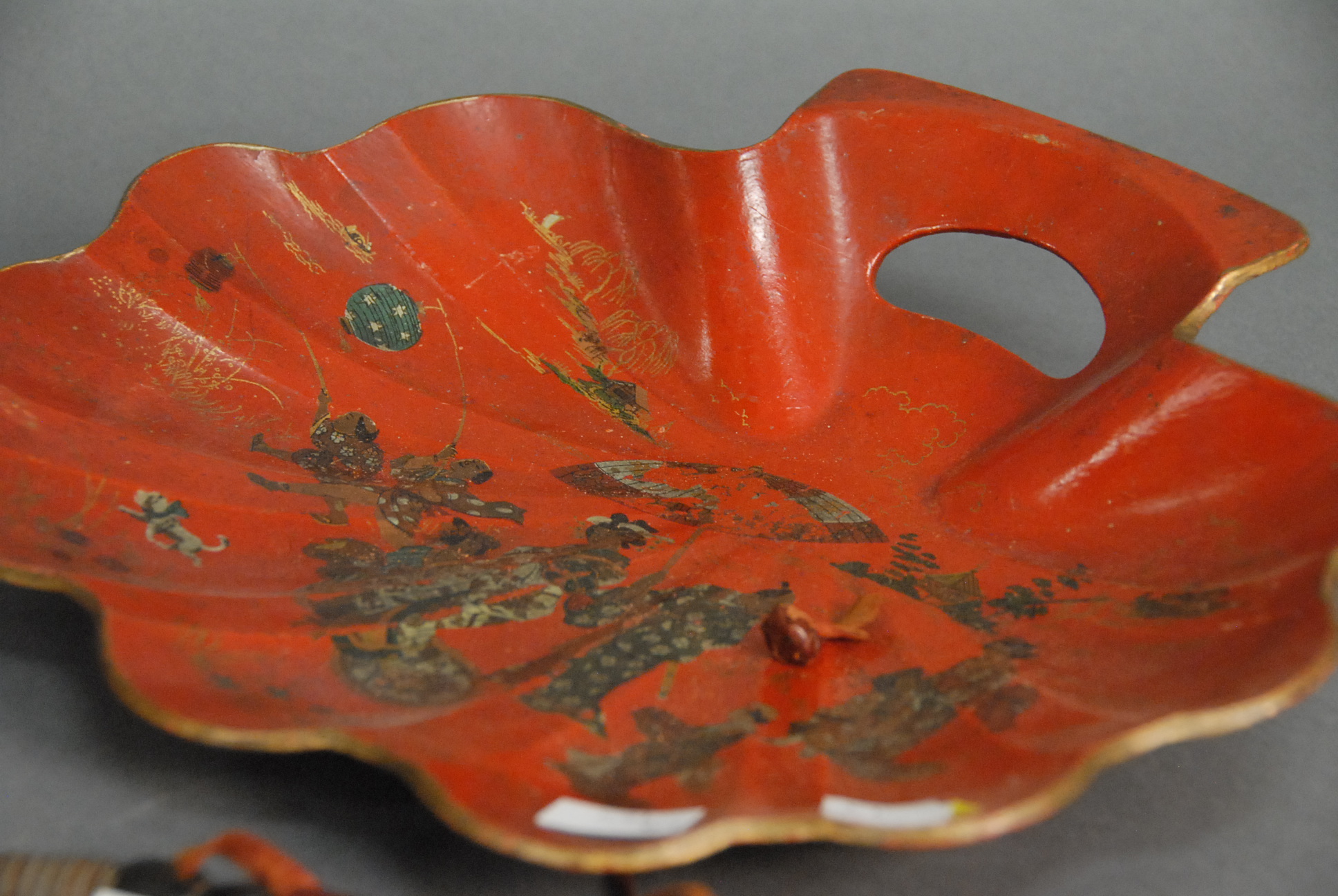 Lot 21: Five piece Oriental group to include a red lacquered shell shaped dish 12in., brush lg. 13 1/2in., red painted tin teapot, and two k…