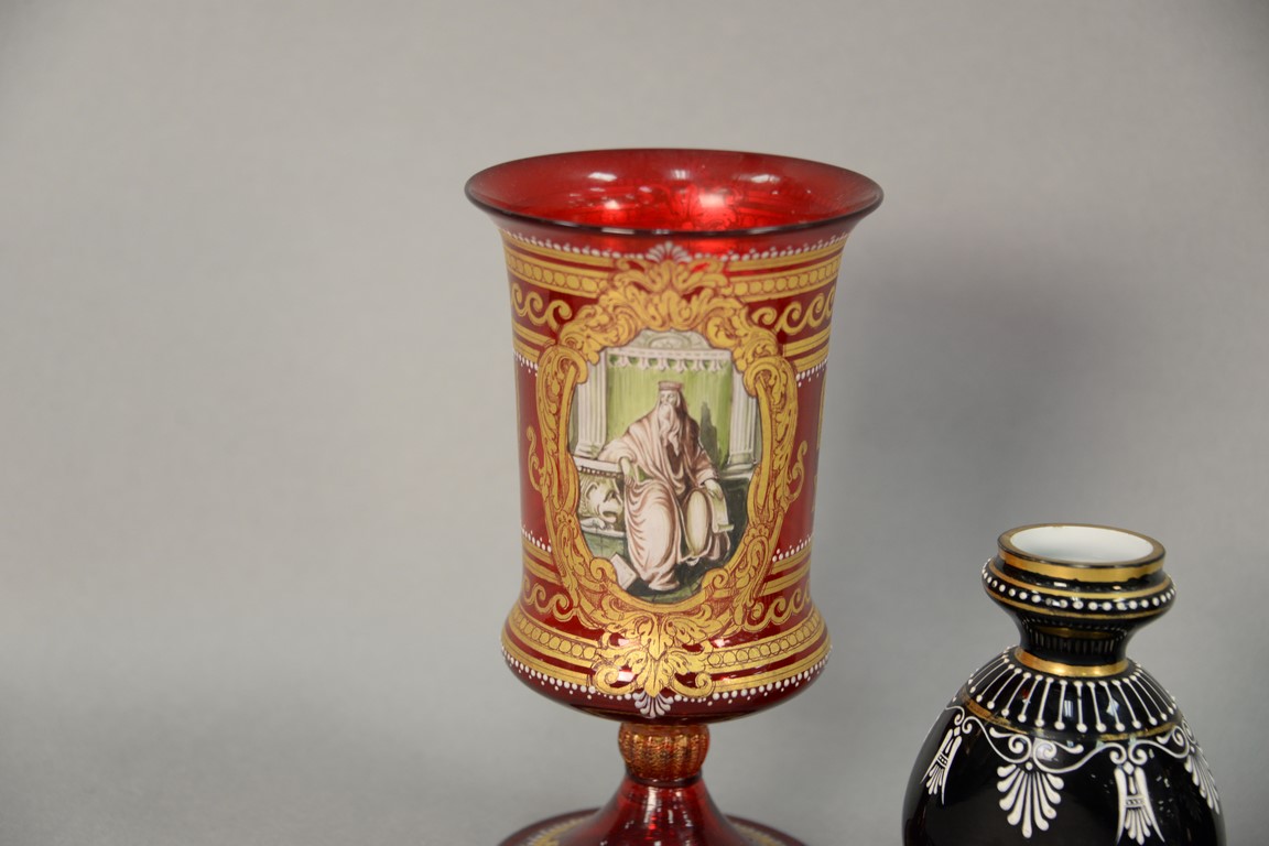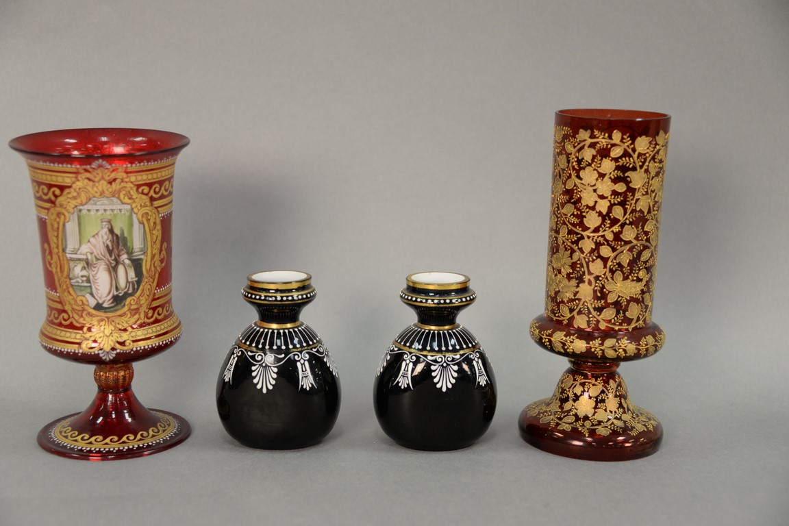 Four piece art glass group to include a pair of small black glass vases with white enamel ht. 4, ruby glass vase with gilt scrolling flowers and vines ht. 8, and ruby red stemmed cup with enameled and painted gotic scene ht. 7.
