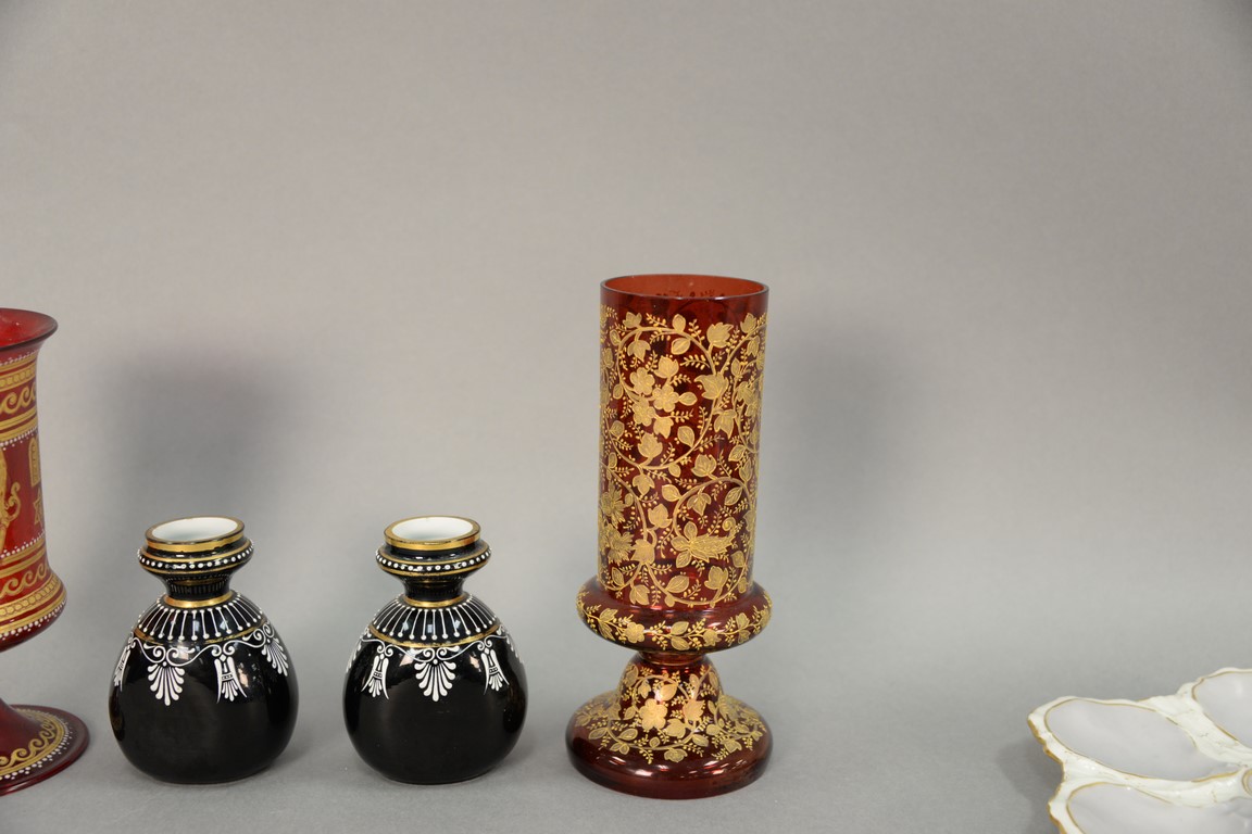 Lot 21: Four piece art glass group to include a pair of small black glass vases with white enamel ht. 4, ruby glass vase with gilt scroll…